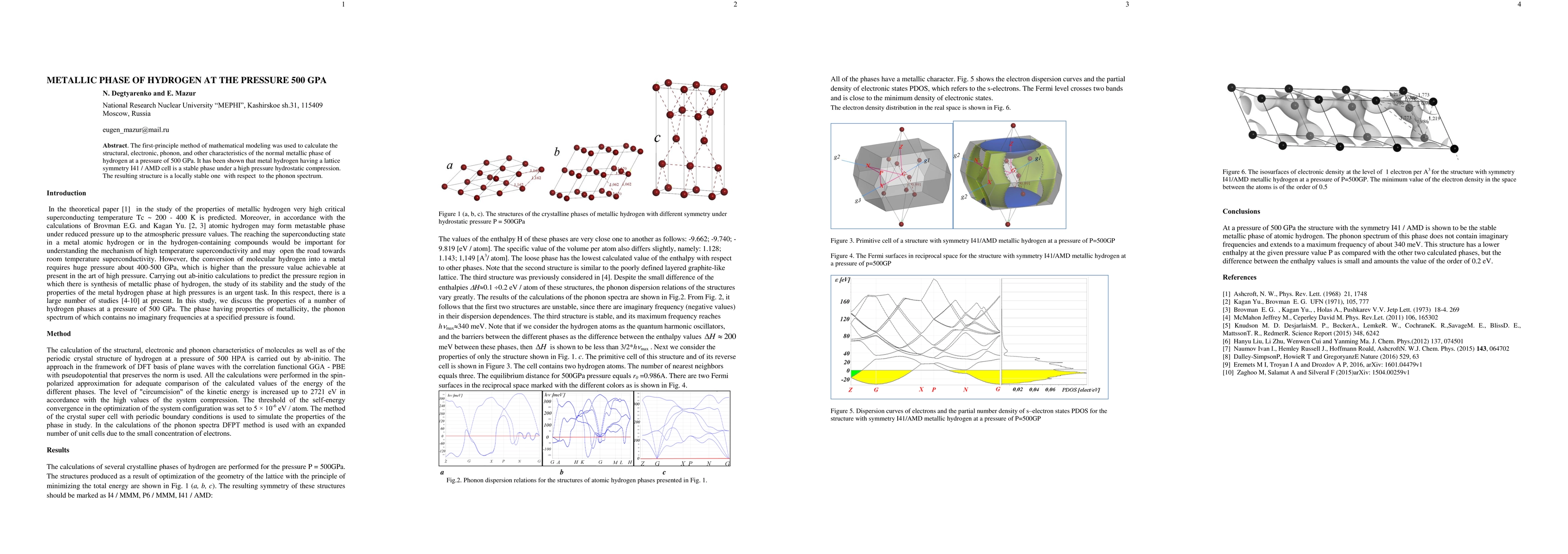 The first-principle method of mathematical modeling was used to calculate the structural, electronic, phonon, and other characteristics of the normal metallic phase of hydrogen at a pressure of 500 GPa. It has been shown that metal hydrogen having a lattice symmetry I41 / AMD cell is a stable phase under a high pressure hydrostatic compression. The resulting structure is a locally stable one with respect to the phonon spectrum.