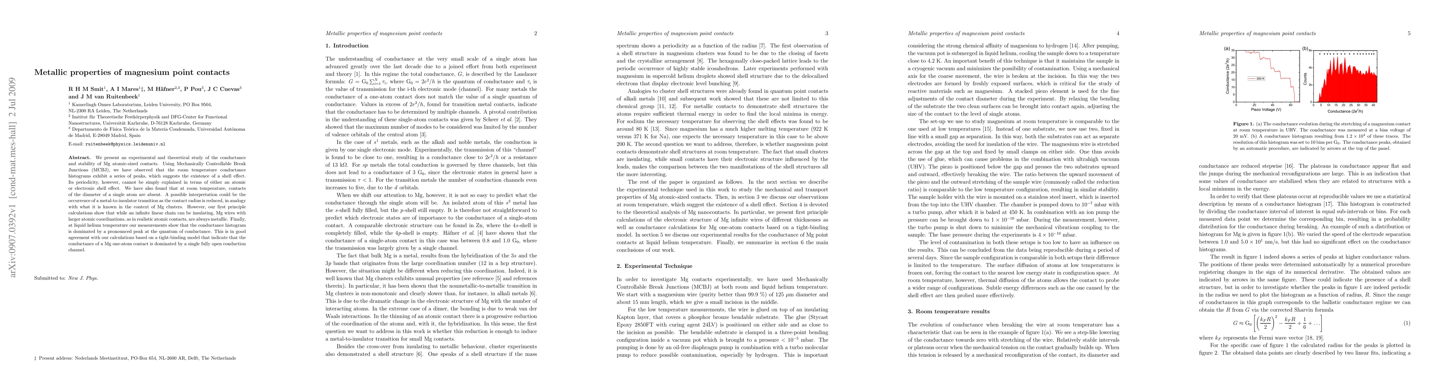Researchers studied the conductance of magnesium atomic-sized contacts using mechanical break junctions, finding that at room temperature, smaller contacts may transition from metal to insulator, but first-principle calculations show they remain metallic. At liquid helium temperature, a single conduction channel dominates the conductance.