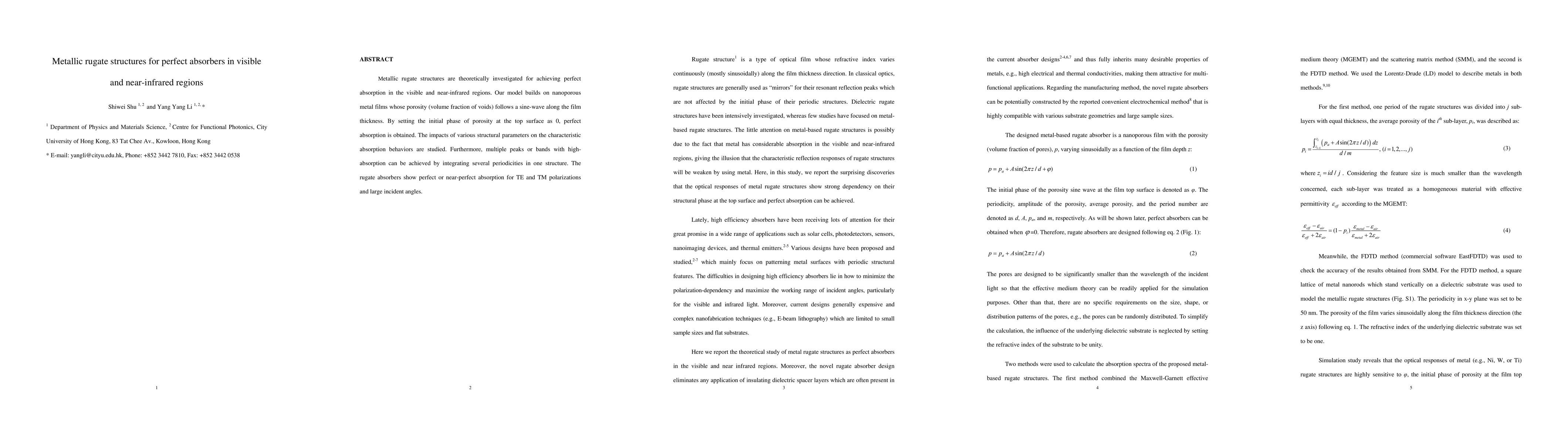 This paper investigates metallic rugate structures, specifically nanoporous metal films with sine-wave porosity variations, to achieve perfect absorption in the visible and near-infrared regions. The study finds that setting the initial phase of porosity at 0 at the top surface results in optimal absorption, and multiple periodicities can create multiple high-absorption peaks.