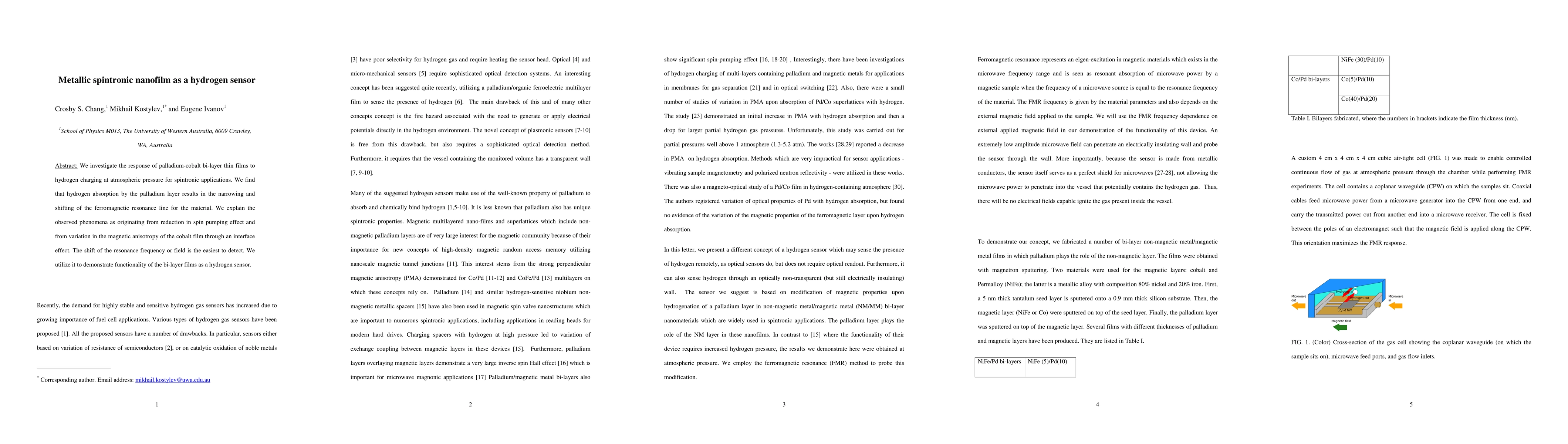 The research explores palladium-cobalt bi-layer thin films' response to hydrogen, discovering that hydrogen absorption by palladium alters the ferromagnetic resonance line. This change is attributed to reduced spin pumping and magnetic anisotropy variation in cobalt, enabling the bi-layer to function as a hydrogen sensor.