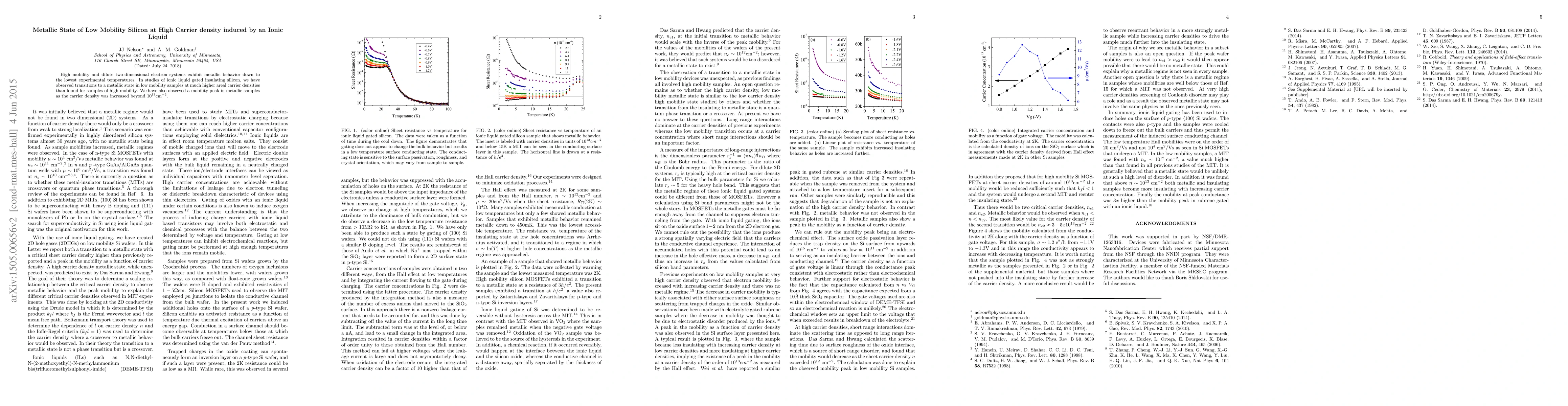 This study reveals that low mobility silicon, when gated with an ionic liquid, can transition to a metallic state at higher carrier densities than high mobility silicon. Additionally, a mobility peak is observed in these metallic samples as carrier density exceeds $10^{13} \text{cm}^{-2}$.