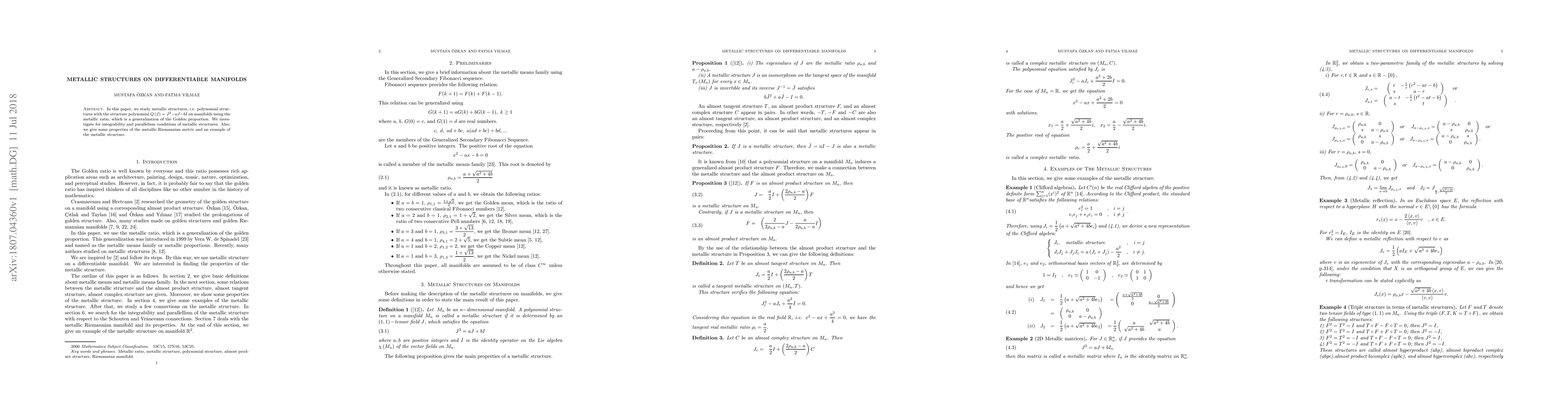 In this paper, we study metallic structures, i.e. polynomial structures with the structure polynomial $Q\left( J\right) =J^{2}-aJ-bI$ on manifolds using the metallic ratio, which is a generalization of the Golden proportion. We investigate for integrability and parallelism conditions of metallic structures. Also, we give some properties of the metallic Riemannian metric and an example of the metallic structure.
