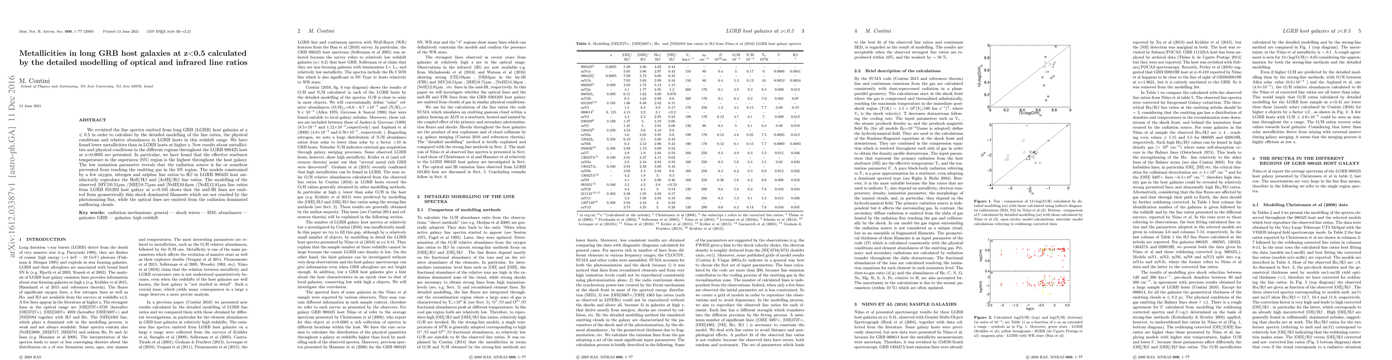 We revisited the line spectra emitted from long GRB (LGRB) host galaxies at z<0.5 in order to calculate by the detailed modelling of the line ratios the physical conditions and relative abundances in LGRB hosts in this redshift range. We have found lower metallicities than in LGRB hosts at higher z. New results about metallicities and physical conditions in the different regions throughout the LGRB 980425 host at z=0.0085 are presented. In particular, we have found that the effective starburst temperature in the supernova (SN) region is the highest throughout the host galaxy. The low ionization parameter reveals that the radiation source is far or somehow prevented from reaching the emitting gas in the SN region. The models constrained by a few oxygen, nitrogen and sulphur line ratios to Hb in LGRB 980425 host satisfactorily reproduce the HeII/Hb and [ArIII]/Hb line ratios. The modelling of the observed [SIV]10.51\mu/[SIII]18.71\mum and [NeIII]10.6\mum/[NeII]12.81\mum line ratios from LGRB 031203 host galaxy at z=0.105 shows that the mid-IR lines are emitted from geometrically thin shock dominated filaments which are not reached by the photoionizing flux, while the optical lines are emitted from the radiation dominated outflowing clouds.