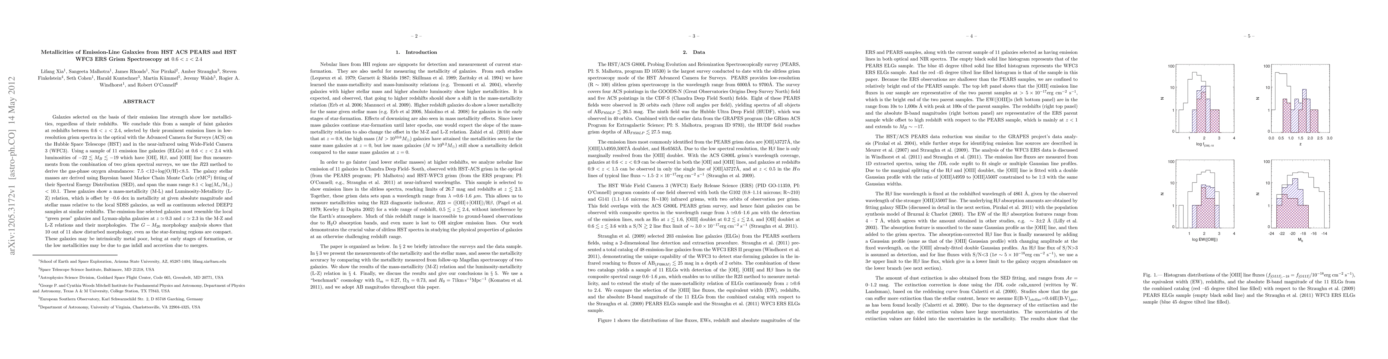Galaxies selected on the basis of their emission line strength show low metallicities, regardless of their redshifts. We conclude this from a sample of faint galaxies at redshifts between 0.6 < z < 2.4, selected by their prominent emission lines in low-resolution grism spectra in the optical with the Advanced Camera for Surveys (ACS) on the Hubble Space Telescope (HST) and in the near-infrared using Wide-Field Camera 3 (WFC3). Using a sample of 11 emission line galaxies (ELGs) at 0.6 < z < 2.4 with luminosities of -22 < M_B < -19, which have [OII], H\beta, and [OIII] line flux measurements from the combination of two grism spectral surveys, we use the R23 method to derive the gas-phase oxygen abundances: 7.5 < 12+log(O/H) < 8.5. The galaxy stellar masses are derived using Bayesian based Markov Chain Monte Carlo (\piMC^2) fitting of their Spectral Energy Distribution (SED), and span the mass range 8.1 < log(M_*/M_\sun) < 10.1. These galaxies show a mass-metallicity (M-L) and Luminosity-Metallicity (L-Z) relation, which is offset by --0.6 dex in metallicity at given absolute magnitude and stellar mass relative to the local SDSS galaxies, as well as continuum selected DEEP2 samples at similar redshifts. The emission-line selected galaxies most resemble the local "green peas" galaxies and Lyman-alpha galaxies at z~0.3 and z~2.3 in the M-Z and L-Z relations and their morphologies. The G-M_{20} morphology analysis shows that 10 out of 11 show disturbed morphology, even as the star-forming regions are compact. These galaxies may be intrinsically metal poor, being at early stages of formation, or the low metallicities may be due to gas infall and accretion due to mergers.