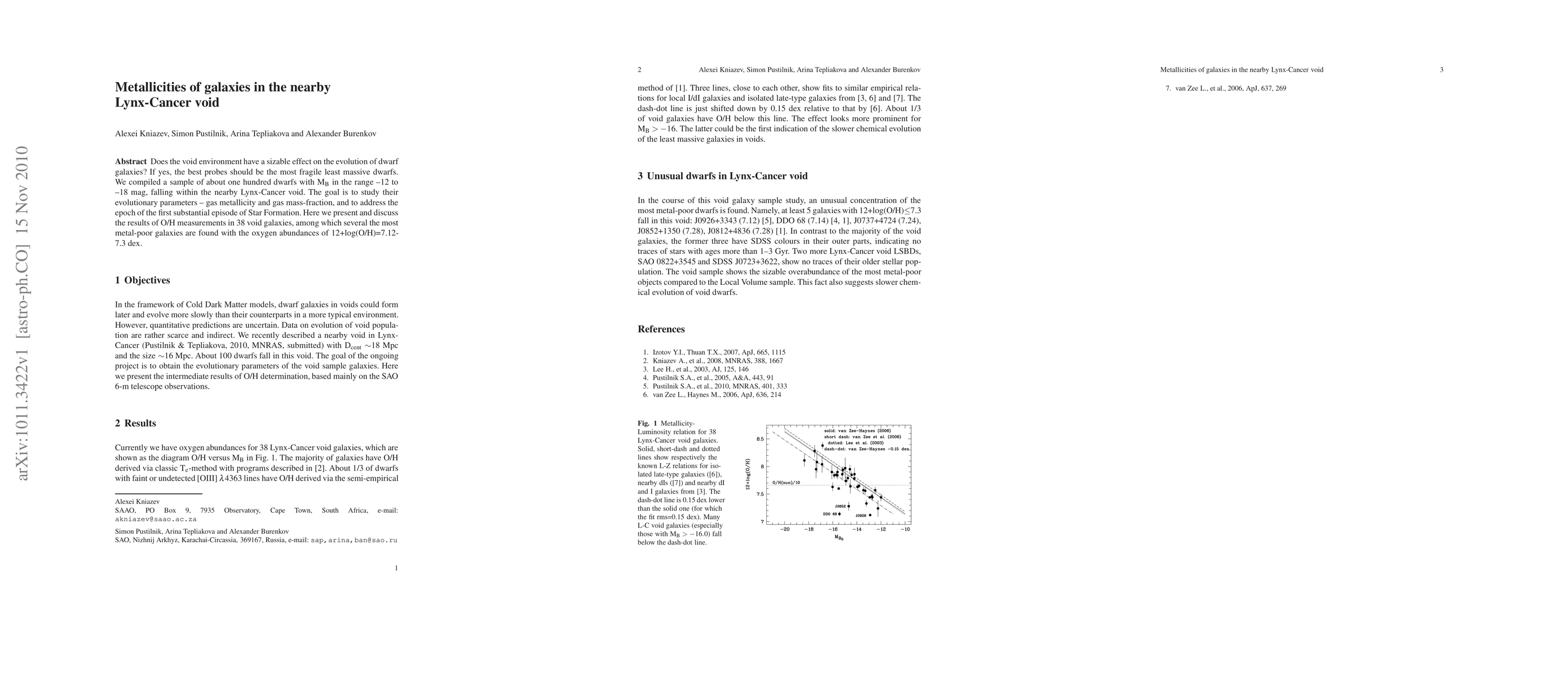 This paper investigates the metallicities of dwarf galaxies in the Lynx-Cancer void to determine if the void environment influences their evolution. The study finds several of the most metal-poor galaxies within the void, with oxygen abundances ranging from 12+log(O/H)=7.12 to 7.3 dex.