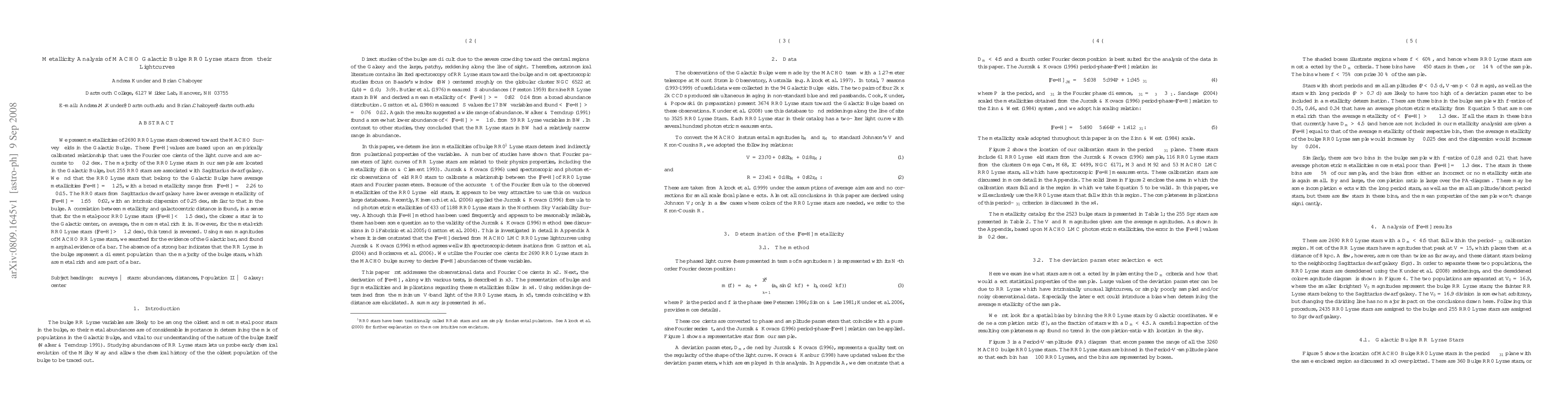 We present metallicities of 2690 RR0 Lyrae stars observed toward the MACHO Survey fields in the Galactic Bulge. These [Fe/H] values are based upon an empirically calibrated relationship that uses the Fourier coefficients of the light curve and are accurate to ~0.2 dex. The majority of the RR0 Lyrae stars in our sample are located in the Galactic Bulge, but 255 RR0 stars are associated with Sagittarius dwarf galaxy. We find that the RR0 Lyrae stars that belong to the Galactic Bulge have average metallicities [Fe/H] = -1.25, with a broad metallicity range from [Fe/H] = -2.26 to -0.15. The RR0 stars from Sagittarius dwarf galaxy have lower average metallicity of [Fe/H] = -1.55 \pm 0.02, with an intrinsic dispersion of 0.25 dex, similar to that in the bulge. A correlation between metallicity and galactocentric distance is found, in a sense that for the metal-poor RR0 Lyrae stars ([Fe/H]< -1.5 dex), the closer a star is to the Galactic center, on average, the more metal rich it is. However, for the metal-rich RR0 Lyrae stars ([Fe/H] > -1.2 dex), this trend is reversed. Using mean magnitudes of MACHO RR Lyrae stars, we searched for the evidence of the Galactic bar, and found marginal evidence of a bar. The absence of a strong bar indicates that the RR Lyrae in the bulge represent a different population than the majority of the bulge stars, which are metal rich and are part of a bar.