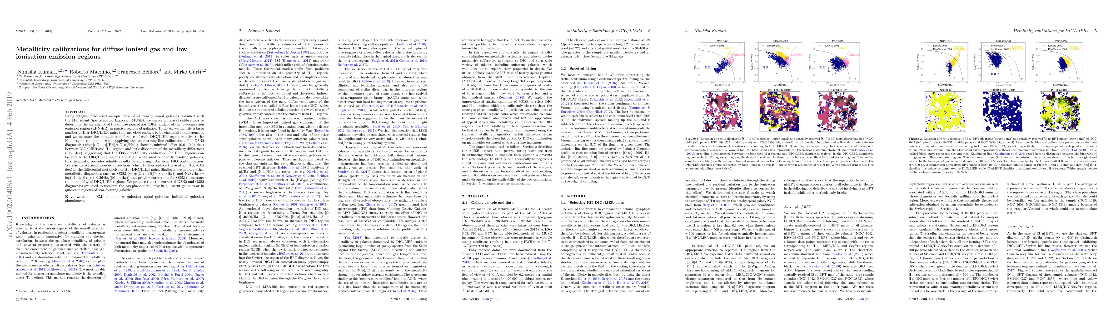 This paper uses MUSE integral field spectroscopic data from 24 nearby spiral galaxies to derive empirical calibrations for determining the metallicity of diffuse ionized gas and low-ionisation emission regions. The O3N2 diagnostic shows minimal offset and dispersion, suggesting it can reliably measure metallicity in quiescent regions, with second-order corrections further reducing scatter.