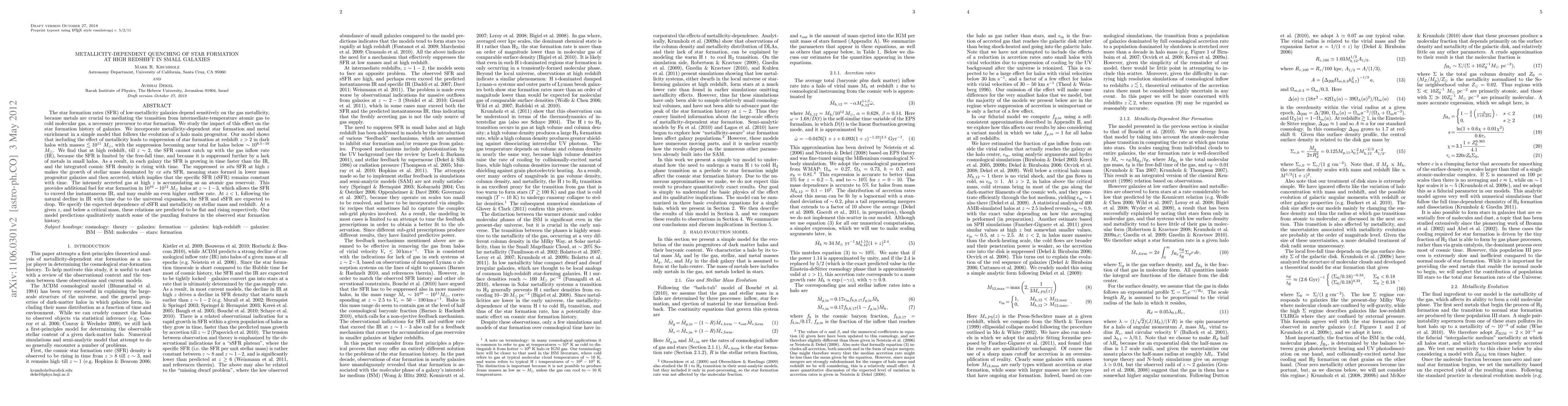 This paper investigates how low-metallicity galaxies experience quenching of star formation at high redshift due to the crucial role of metals in gas transition processes. The model predicts significant suppression of star formation in small galaxies at z>2, with the specific star formation rate remaining constant over time due to the dominance of ex situ star formation.