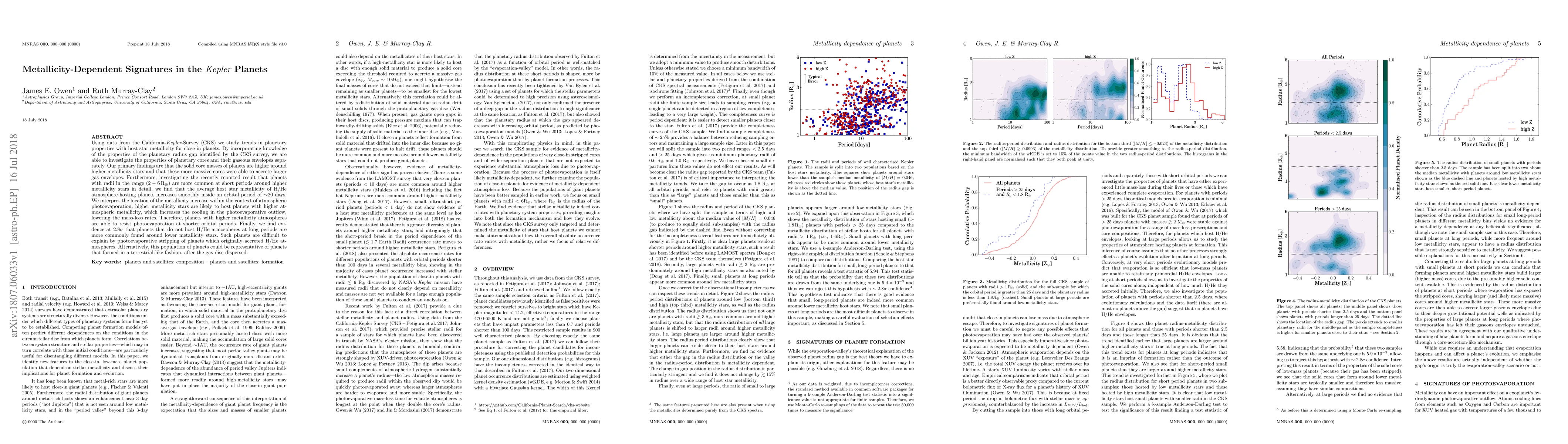 Using data from the California-Kepler-Survey (CKS) we study trends in planetary properties with host star metallicity for close-in planets. By incorporating knowledge of the properties of the planetary radius gap identified by the CKS survey, we are able to investigate the properties of planetary cores and their gaseous envelopes separately. Our primary findings are that the solid core masses of planets are higher around higher metallicity stars and that these more massive cores were able to accrete larger gas envelopes. Furthermore, investigating the recently reported result that planets with radii in the range (2-6Rearth) are more common at short periods around higher metallicity stars in detail, we find that the average host star metallicity of H/He atmosphere-hosting planets increases smoothly inside an orbital period of ~20 days. We interpret the location of the metallicity increase within the context of atmospheric photoevaporation: higher metallicity stars are likely to host planets with higher atmospheric metallicity, which increases the cooling in the photoevaporative outflow, lowering the mass-loss rates. Therefore, planets with higher metallicity atmospheres are able to resist photoevaporation at shorter orbital periods. Finally, we find evidence at 2.8 sigma that planets that do not host H/He atmospheres at long periods are more commonly found around lower metallicity stars. Such planets are difficult to explain by photoevaporative stripping of planets which originally accreted H/He atmospheres. Alternatively, this population of planets could be representative of planets that formed in a terrestrial-like fashion, after the gas disc dispersed.