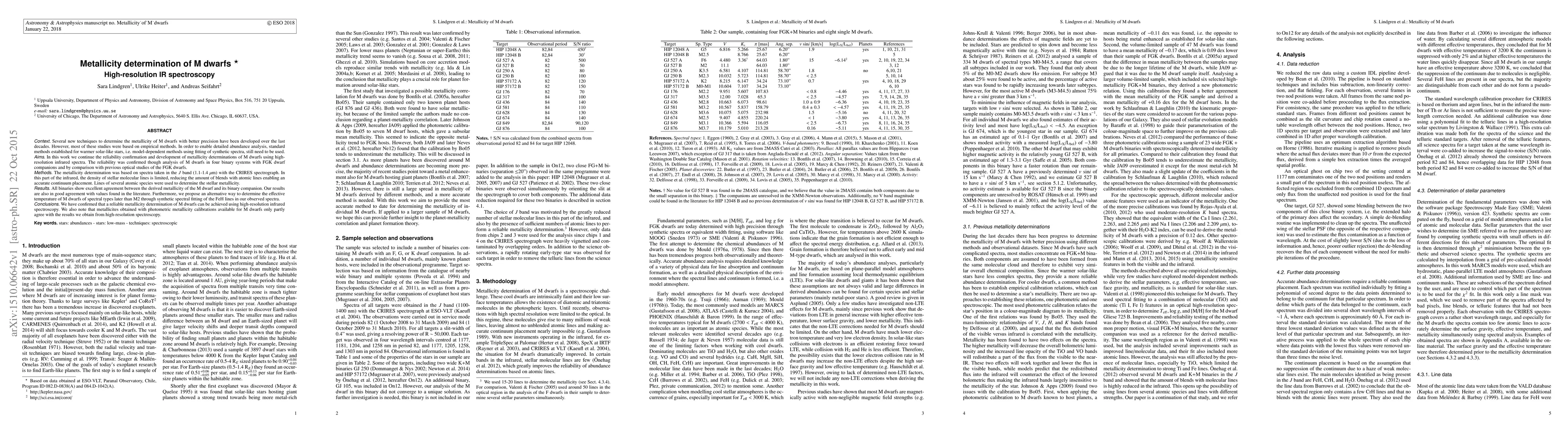Context. Several new techniques to determine the metallicity of M dwarfs with better precision have been developed over the last decades. However, most of these studies were based on empirical methods. In order to enable detailed abundance analysis, standard methods established for warmer solar-like stars, i.e. model-dependent methods using fitting of synthetic spectra, still need to be used. Aims. In this work we continue the reliability confirmation and development of metallicity determinations of M dwarfs using high- resolution infrared spectra. The reliability was confirmed though analysis of M dwarfs in four binary systems with FGK dwarf companions and by comparison with previous optical studies of the FGK dwarfs. Methods. The metallicity determination was based on spectra taken in the J band (1.1-1.4 {\mu}m) with the CRIRES spectrograph. In this part of the infrared, the density of stellar molecular lines is limited, reducing the amount of blends with atomic lines enabling an accurate continuum placement. Lines of several atomic species were used to determine the stellar metallicity. Results. All binaries show excellent agreement between the derived metallicity of the M dwarf and its binary companion. Our results are also in good agreement with values found in the literature. Furthermore, we propose an alternative way to determine the effective temperature of M dwarfs of spectral types later than M2 through synthetic spectral fitting of the FeH lines in our observed spectra. Conclusions. We have confirmed that a reliable metallicity determination of M dwarfs can be achieved using high-resolution infrared spectroscopy. We also note that metallicites obtained with photometric metallicity calibrations available for M dwarfs only partly agree with the results we obtain from high-resolution spectroscopy.