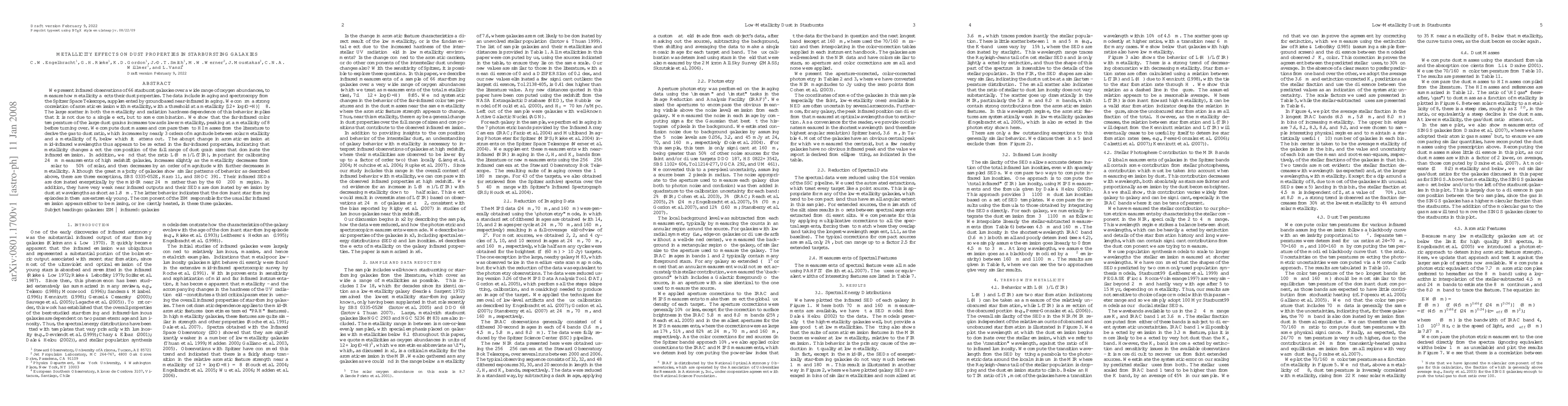 This paper investigates the impact of metallicity on dust properties in 66 starburst galaxies using Spitzer and ground-based infrared observations. It finds a strong correlation between aromatic emission and metallicity, with a threshold at [12+log(O/H)]~8, and shows that the far-infrared color temperature of large dust grains increases towards lower metallicity. The gas-to-dust ratio also increases significantly at low metallicity.
