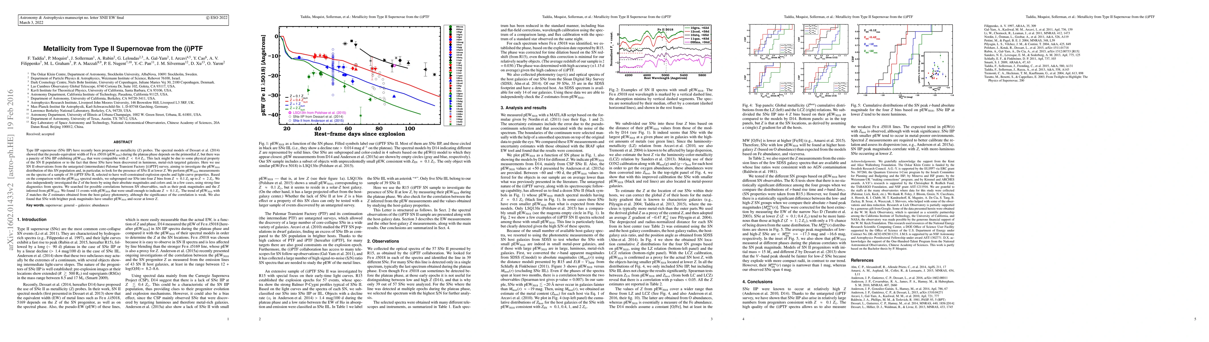 Type IIP supernovae (SNe IIP) have recently been proposed as metallicity ($Z$) probes. The spectral models of Dessart et al. (2014) showed that the pseudo-equivalent width of Fe II $\lambda$5018 (pEW$_{5018}$) during the plateau phase depends on the primordial $Z$, but there was a paucity of SNe IIP exhibiting pEW$_{5018}$ that were compatible with $Z < 0.4$ ${\rm Z}_{\odot}$. This lack might be due to some physical property of the SN II population or to the fact that those SNe have been discovered in luminous, metal-rich targeted galaxies. Here we use SN II observations from the untargeted (intermediate) Palomar Transient Factory [(i)PTF] survey, aiming to investigate the pEW$_{5018}$ distribution of this SN population and, in particular, to look for the presence of SNe II at lower $Z$. We perform pEW$_{5018}$ measurements on the spectra of a sample of 39 (i)PTF SNe II, selected to have well-constrained explosion epochs and light-curve properties. Based on the comparison with the pEW$_{5018}$ spectral models, we subgrouped our SNe into four $Z$ bins from $Z \approx 0.1$ $Z_{\odot}$ up to $Z \approx 2$ $Z_{\odot}$. We also independently investigated the $Z$ of the hosts by using their absolute magnitudes and colors and, in a few cases, using strong-line diagnostics from spectra. We searched for possible correlations between SN observables, such as their peak magnitudes and the $Z$ inferred from pEW$_{5018}$. We found 11 events with pEW$_{5018}$ that were small enough to indicate $Z \approx 0.1$ $Z_{\odot}$. The trend of pEW$_{5018}$ with $Z$ matches the $Z$ estimates obtained from the host-galaxy photometry, although the significance of the correlation is weak. We also found that SNe with brighter peak magnitudes have smaller pEW$_{5018}$ and occur at lower $Z$.