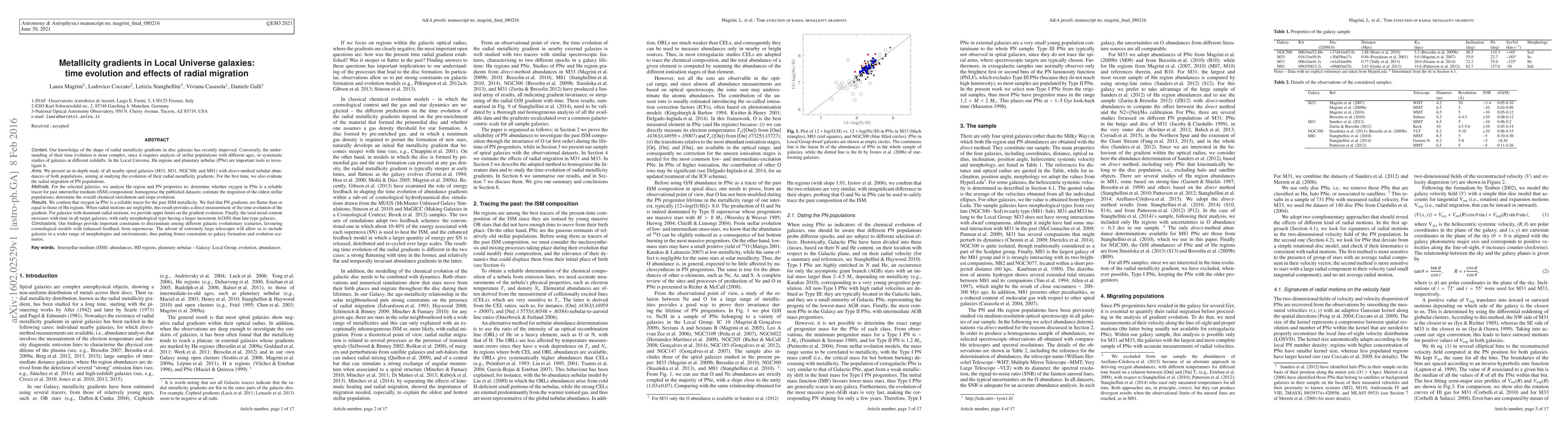 This study investigates the radial metallicity gradients in nearby spiral galaxies, focusing on the time evolution and effects of radial migration. The research confirms that oxygen in planetary nebulae is a reliable tracer for past interstellar medium composition, revealing that gradients in planetary nebulae are generally flatter than those in HII regions. The findings suggest that the total metal content increases over time, with early-type galaxies showing a larger increment in metallicity, supporting models with enhanced feedback from supernovae.