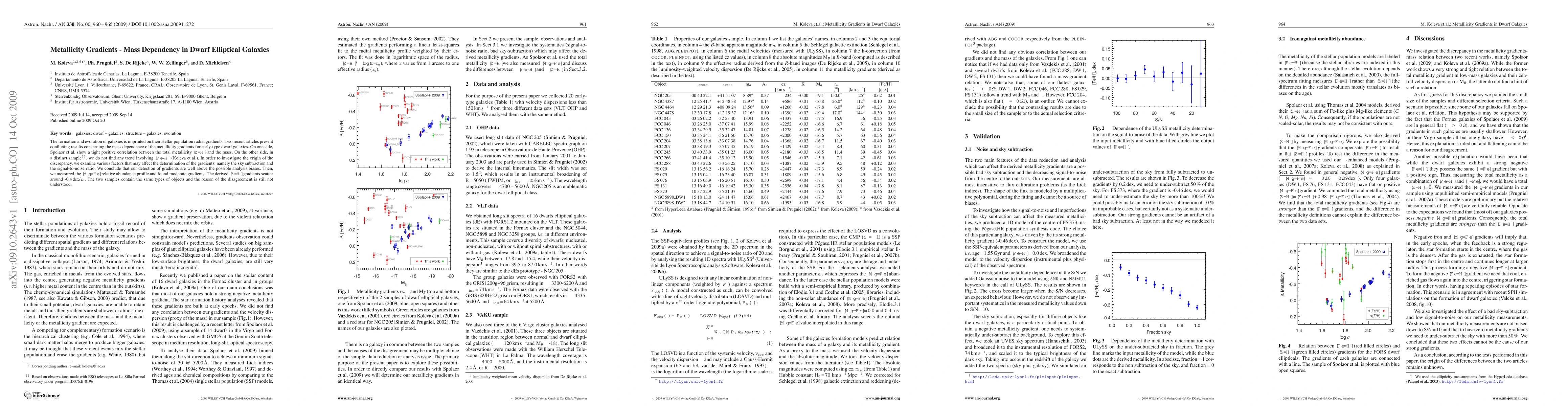 This paper investigates the metallicity gradients in dwarf elliptical galaxies, finding moderate gradients in Mg/Fe and Z/H, but no clear mass dependency in Fe/H, contrasting with previous findings. The discrepancy is not resolved, suggesting factors like sky subtraction and signal-to-noise ratio may not be the root cause.