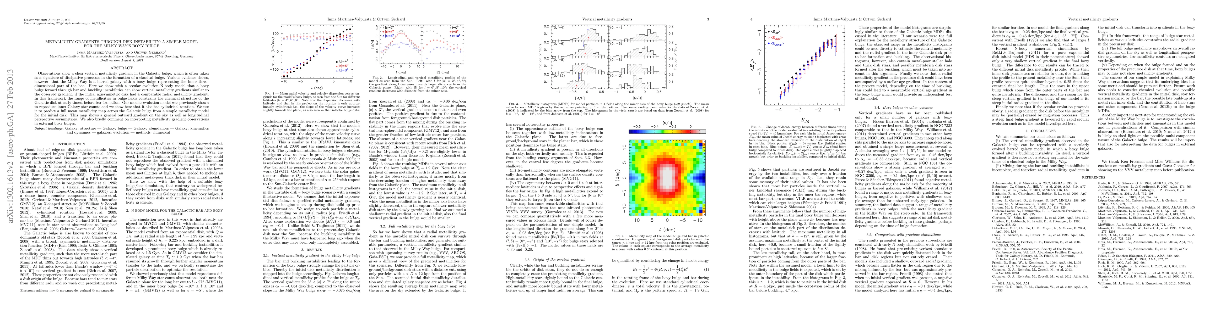 This paper presents a secular evolution N-body model demonstrating that a boxy bulge formed through bar and buckling instabilities can exhibit vertical metallicity gradients similar to those observed in the Milky Way's Galactic bulge, provided the initial disk had a comparable radial metallicity gradient. The model predicts a full mean metallicity map across the bulge, showing an outward gradient and longitudinal perspective asymmetries.