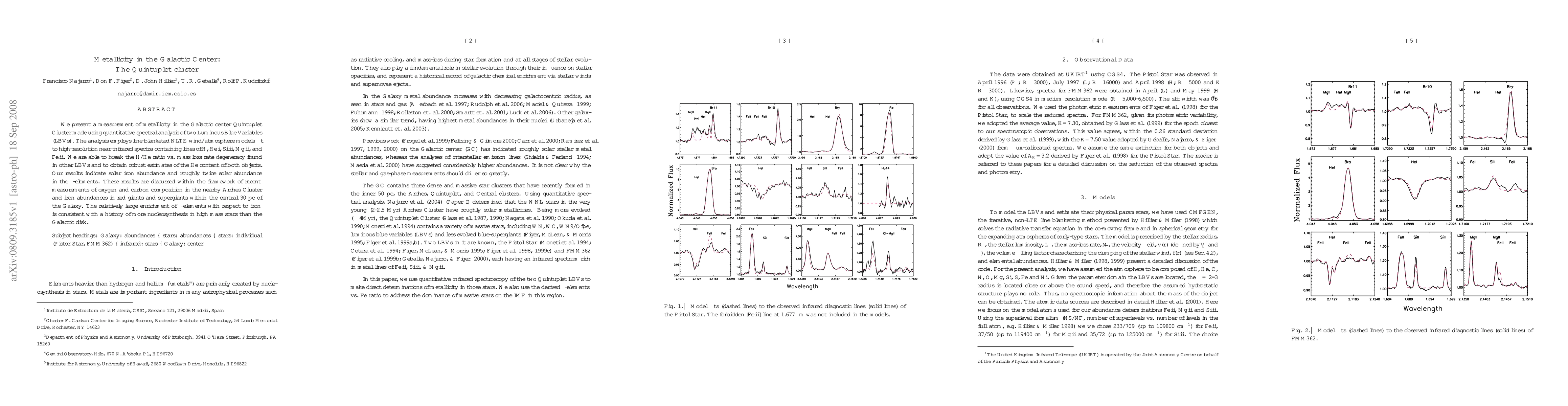 This study measures metallicity in the Galactic Center's Quintuplet Cluster using spectral analysis of two Luminous Blue Variables, revealing solar iron abundance and roughly twice the solar abundance in alpha-elements. The findings suggest a higher rate of nucleosynthesis in high-mass stars compared to the Galactic disk.