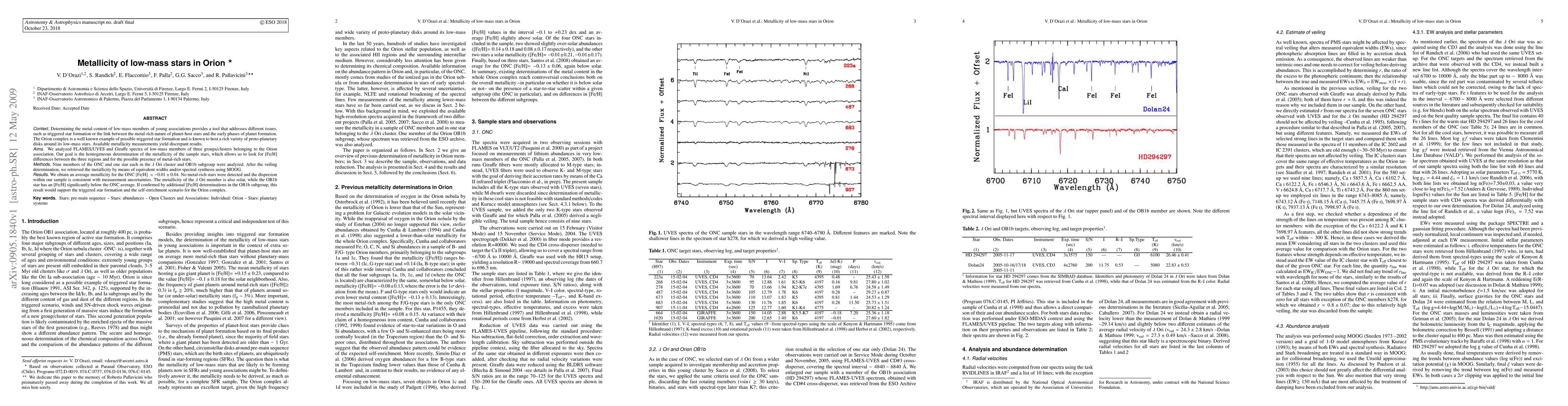 Determining the metal content of low-mass members of young associations provides a tool that addresses different issues, such as triggered star formation or the link between the metal-rich nature of planet-host stars and the early phases of planet formation. The Orion complex is a well known example of possible triggered star formation and is known to host a rich variety of proto-planetary disks around its low-mass stars. Available metallicity measurements yield discrepant results. We analyzed FLAMES/UVES and Giraffe spectra of low-mass members of three groups/clusters belonging to the Orion association. Our goal is the homogeneous determination of the metallicity of the sample stars, which allows us to look for [Fe/H] differences between the three regions and for the possible presence of metal-rich stars. Nine members of the ONC and one star each in the $\lambda$ Ori cluster and OB1b subgroup were analyzed. After the veiling determination, we retrieved the metallicity by means of equivalent widths and/or spectral synthesis using MOOG. We obtain an average metallicity for the ONC [Fe/H]=-0.01\pm 0.04. No metal-rich stars were detected and the dispersion within our sample is consistent with measurement uncertainties. The metallicity of the $\lambda$ Ori member is also solar, while the OB1b star has an [Fe/H] significantly below the ONC average. If confirmed by additional [Fe/H] determinations in the OB1b subgroup, this result would support the triggered star formation and the self-enrichment scenario for the Orion complex.