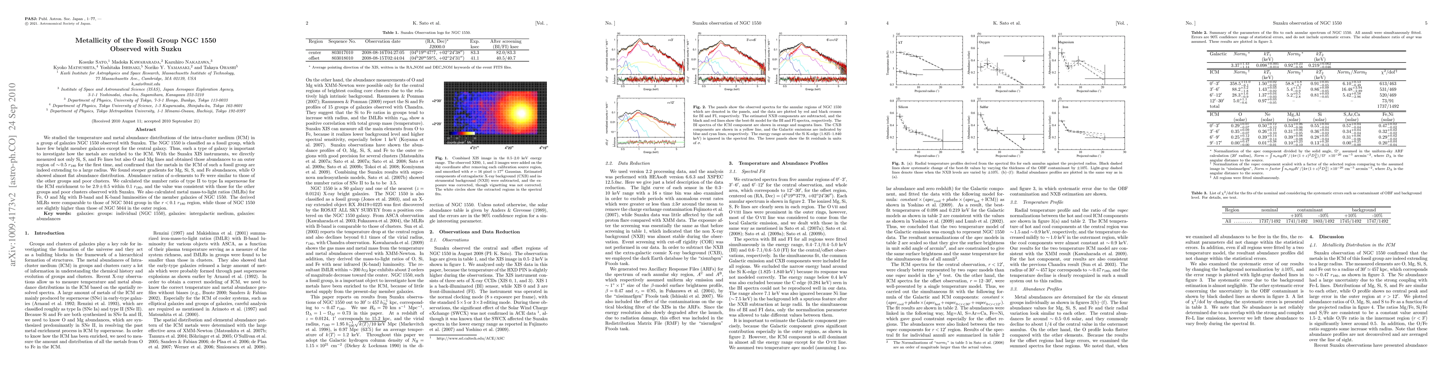 We studied the temperature and metal abundance distributions of the intra-cluster medium (ICM) in a group of galaxies NGC 1550 observed with Suzaku. The NGC 1550 is classified as a fossil group, which have few bright member galaxies except for the central galaxy. Thus, such a type of galaxy is important to investigate how the metals are enriched to the ICM. With the Suzaku XIS instruments, we directly measured not only Si, S, and Fe lines but also O and Mg lines and obtained those abundances to an outer region of ~0.5 r_180 for the first time, and confirmed that the metals in the ICM of such a fossil group are indeed extending to a large radius. We found steeper gradients for Mg, Si, S, and Fe abundances, while O showed almost flat abundance distribution. Abundance ratios of alpha-elements to Fe were similar to those of the other groups and poor clusters. We calculated the number ratio of type II to type Ia supernovae for the ICM enrichment to be 2.9 +- 0.5 within 0.1 r_180, and the value was consistent with those for the other groups and poor clusters observed with Suzaku. We also calculated metal mass-to-light ratios (MLRs) for Fe, O and Mg with B-band and K-band luminosities of the member galaxies of NGC 1550. The derived MLRs were comparable to those of NGC 5044 group in the r<0.1 r_180 region, while those of NGC 1550 are slightly higher than those of NGC 5044 in the outer region.