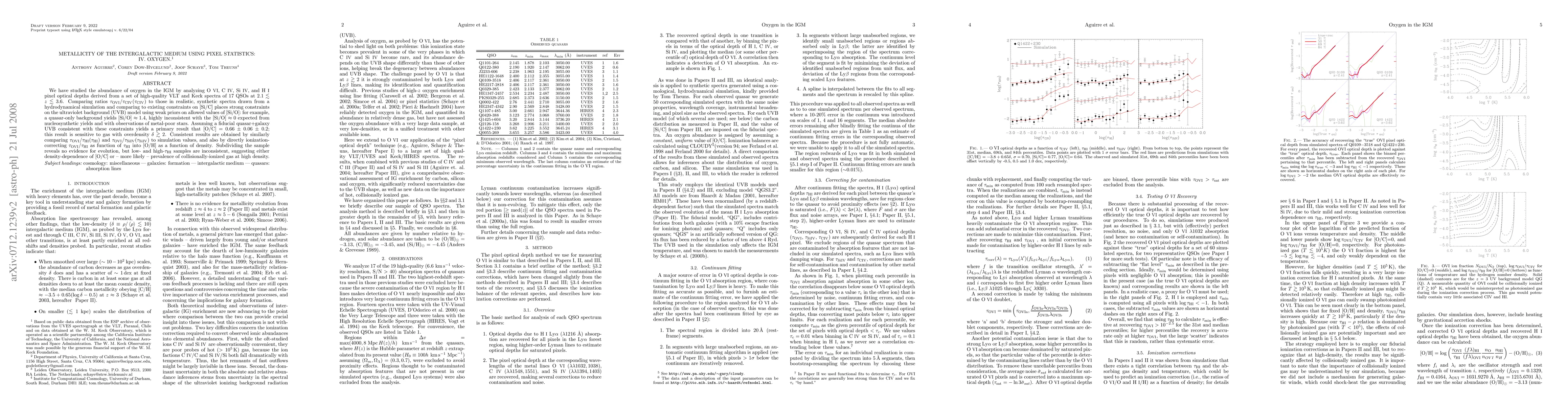 This study analyzes oxygen abundance in the intergalactic medium (IGM) using high-quality spectra from VLT and Keck telescopes. It finds [O/C] = 0.66 +/- 0.06 +/- 0.2, inconsistent with quasar-only UVB models. Results suggest density-dependence of [O/C] or prevalence of collisionally-ionized gas at high density, with no evidence for evolution in subdivided samples.