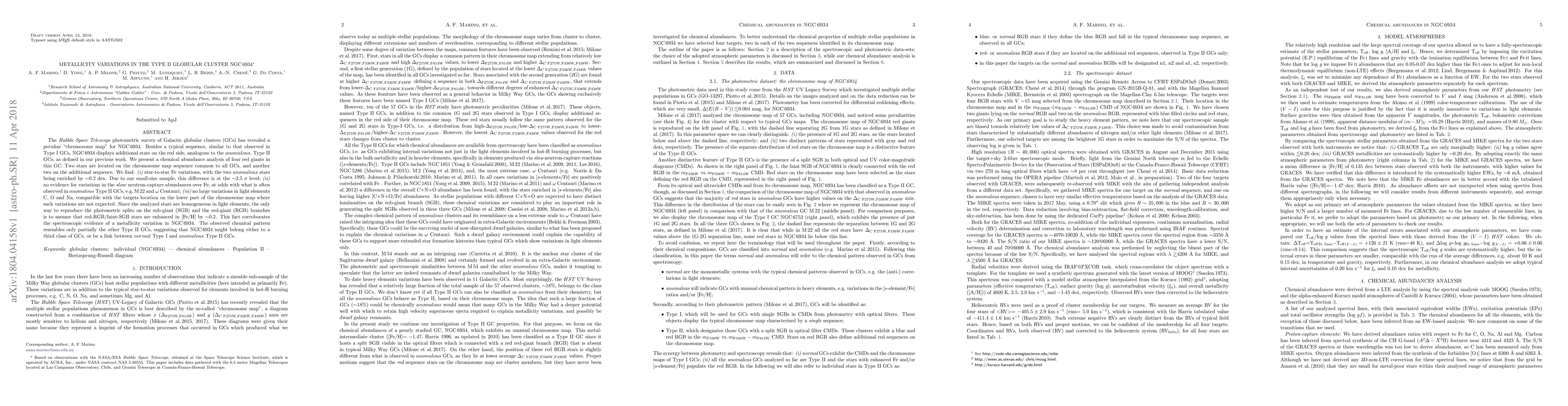 The Hubble Space Telescope photometric survey of Galactic globular clusters (GCs) has revealed a peculiar "chromosome map" for NGC6934. Besides a typical sequence, similar to that observed in Type I GCs, NGC 6934 displays additional stars on the red side, analogous to the anomalous, Type II GCs, as defined in our previous work. We present a chemical abundance analysis of four red giants in this GC. Two stars are located on the chromosome map sequence common to all GCs, and another two on the additional sequence. We find: (i) star-to-star Fe variations, with the two anomalous stars being enriched by ~0.2 dex. Due to our small-size sample, this difference is at the ~2.5 sigma level; (ii) no evidence for variations in the slow neutron-capture abundances over Fe, at odds with what is often observed in anomalous Type II GCs, e.g. M 22 and Omega Centauri; (iii) no large variations in light elements C, O and Na, compatible with the targets location on the lower part of the chromosome map where such variations are not expected. Since the analyzed stars are homogeneous in light elements, the only way to reproduce the photometric splits on the sub-giant (SGB) and the red-giant (RGB) branches is to assume that red-RGB/faint-SGB stars are enhanced in [Fe/H] by ~0.2. This fact corroborates the spectroscopic evidence of a metallicity variation in NGC6934. The observed chemical pattern resembles only partially the other Type II GCs, suggesting that NGC6934 might belong either to a third class of GCs, or be a link between normal Type I and anomalous Type II GCs.