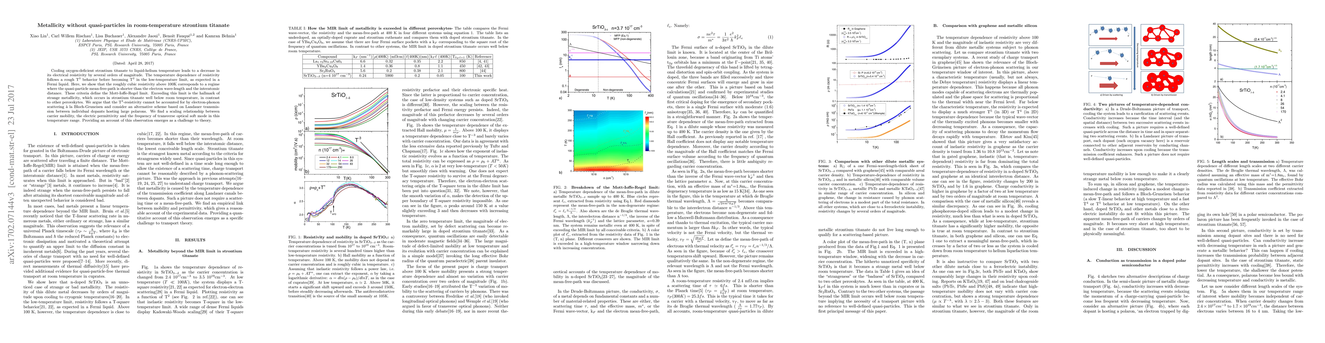This paper investigates the unusual metallic behavior of strontium titanate above 100K, where resistivity follows a T$^{3}$ dependence, indicating metallicity without quasi-particles. The authors propose an alternative explanation for this behavior based on Landauer transmission between dopant-hosted large polarons, challenging conventional electron-phonon scattering models.
