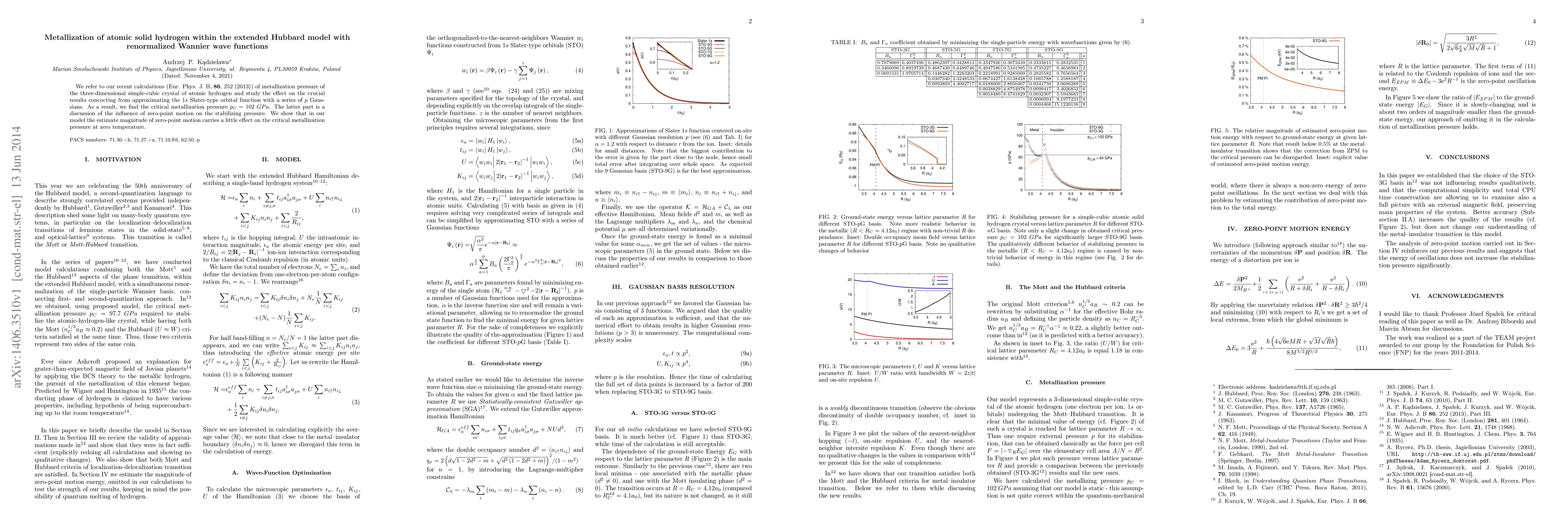 This paper investigates the metallization pressure of atomic solid hydrogen using the extended Hubbard model with renormalized Wannier wave functions, finding a critical pressure of $p_C = 102$ GPa. It also examines the minor impact of zero-point motion on the metallization pressure at zero temperature.