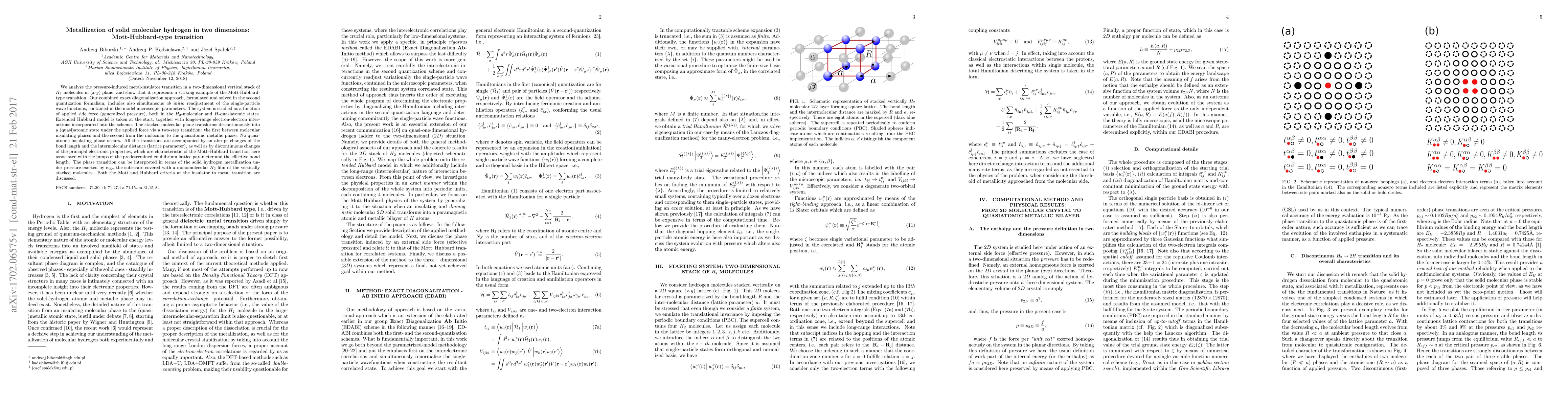 We analyze the pressure-induced metal-insulator transition in a two-dimensional vertical stack of $H_2$ molecules in x-y plane, and show that it represents a striking example of the Mott-Hubbard-type transition. Our combined exact diagonalization approach, formulated and solved in the second quantization formalism, includes also simultaneous ab initio readjustment of the single-particle wave functions, contained in the model microscopic parameters. The system is studied as a function of applied side force (generalized pressure), both in the $H_2$-molecular and $H$-quasiatomic states. Extended Hubbard model is taken at the start, together with longer-range electron-electron interactions incorporated into the scheme. The stacked molecular plane transforms discontinuously into a (quasi)atomic state under the applied force via a two-step transition: the first between molecular insulating phases and the second from the molecular to the quasiatomic metallic phase. No quasiatomic insulating phase occurs. All the transitions are accompanied by an abrupt changes of the bond length and the intermolecular distance (lattice parameter), as well as by discontinuous changes of the principal electronic properties, which are characteristic of the Mott-Hubbard transition here associated with the jumps of the predetermined equilibrium lattice parameter and the effective bond length. The phase transition can be interpreted in terms of the solid hydrogen metallization under pressure exerted by e.g., the substrate covered with a monomolecular $H_2$ film of the vertically stacked molecules. Both the Mott and Hubbard criteria at the insulator to metal transition are discussed.