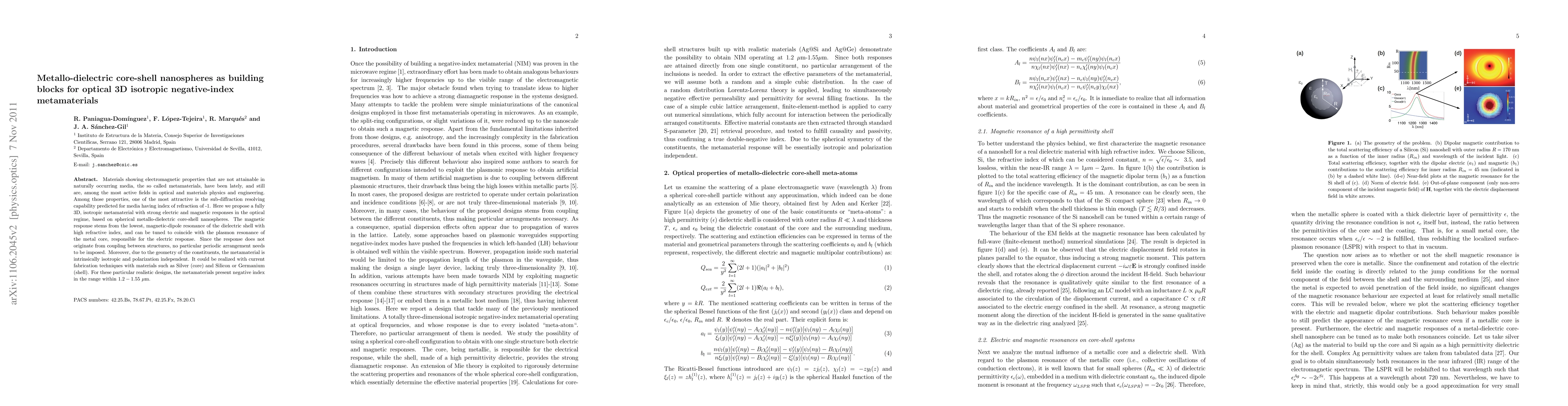 Materials showing electromagnetic properties that are not attainable in naturally occurring media, the so called metamaterials, have been lately, and still are, among the most active fields in optical and materials physics and engineering. Among those properties, one of the most attractive is the sub-diffraction resolving capability predicted for media having index of refraction of -1. Here we propose a fully 3D, isotropic metamaterial with strong electric and magnetic responses in the optical regime, based on spherical metallo-dielectric core-shell nanospheres. The magnetic response stems from the lowest, magnetic-dipole resonance of the dielectric shell with high refractive index, and can be tuned to coincide with the plasmon resonance of the metal core, responsible for the electric response. Since the response does not originate from coupling between structures, no particular periodic arrangement needs to be imposed. Moreover, due to the geometry of the constituents, the metamaterial is intrinsically isotropic and polarization independent. It could be realized with current fabrication techniques with materials such as Silver (core) and Silicon or Germanium (shell). For these particular realistic designs, the metamaterials present negative index in the range within 1.2-1.55 microns.