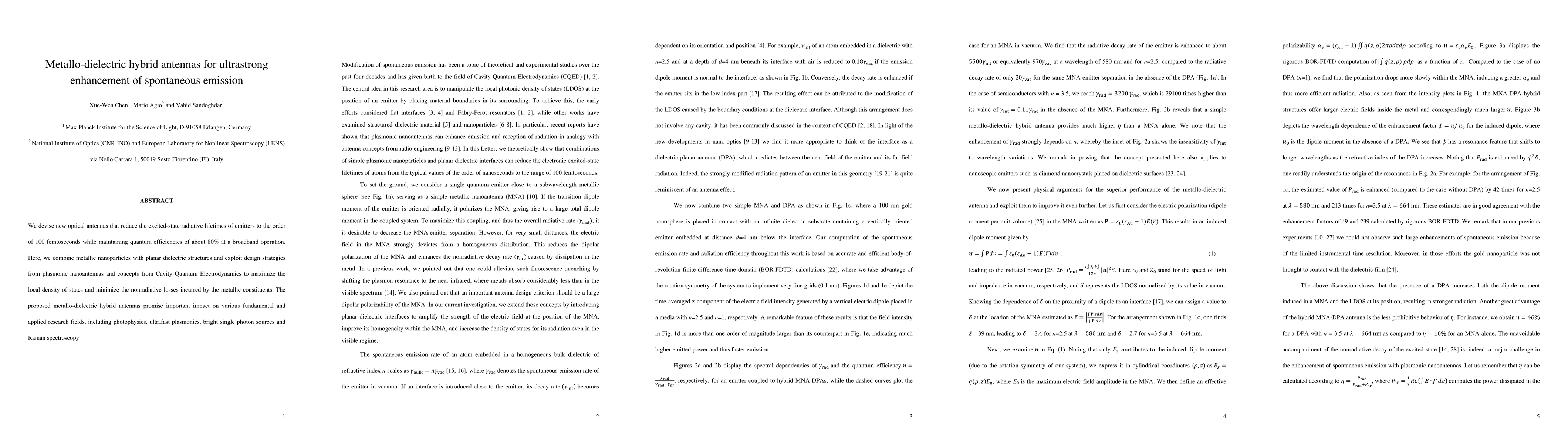 This paper introduces innovative metallo-dielectric hybrid antennas that significantly reduce the radiative lifetimes of emitters to 100 femtoseconds while preserving quantum efficiencies of around 80% across a broad spectrum. The design combines metallic nanoparticles with dielectric structures to optimize local density of states and minimize nonradiative losses.
