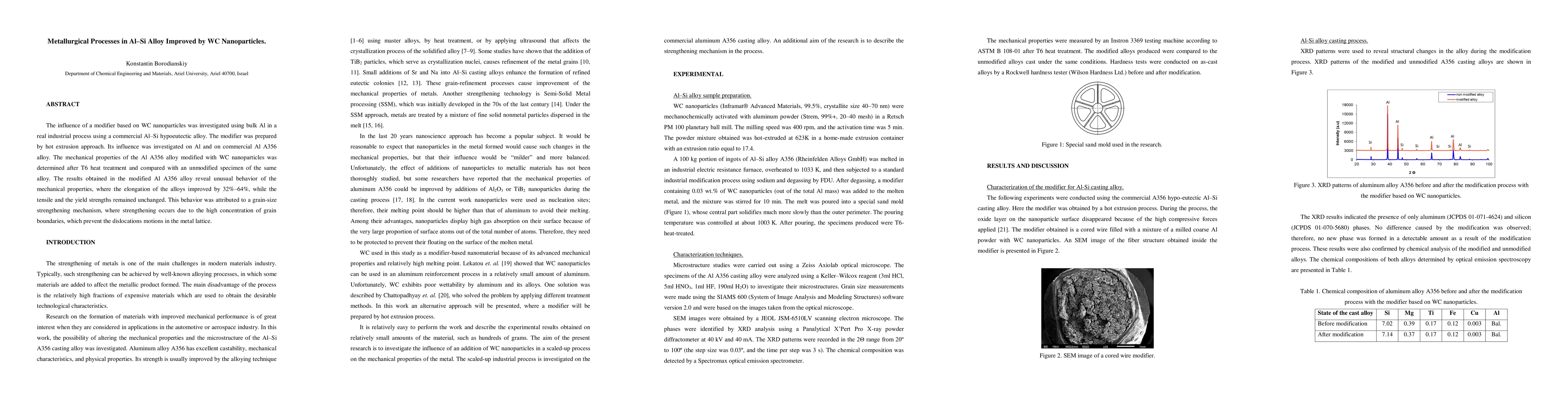 The influence of a modifier based on WC nanoparticles was investigated using bulk Al in a real industrial process using a commercial AlSi hypoeutectic alloy. The modifier was prepared by hot extrusion approach. Its influence was investigated on Al and on commercial Al A356 alloy. The mechanical properties of the Al A356 alloy modified with WC nanoparticles was determined after T6 heat treatment and compared with an unmodified specimen of the same alloy. The results obtained in the modified Al A356 alloy reveal unusual behavior of the mechanical properties, where the elongation of the alloys improved by 32% 64%, while the tensile and the yield strengths remained unchanged. This behavior was attributed to a grain size strengthening mechanism, where strengthening occurs due to the high concentration of grain boundaries, which prevent the dislocations motions in the metal lattice.
