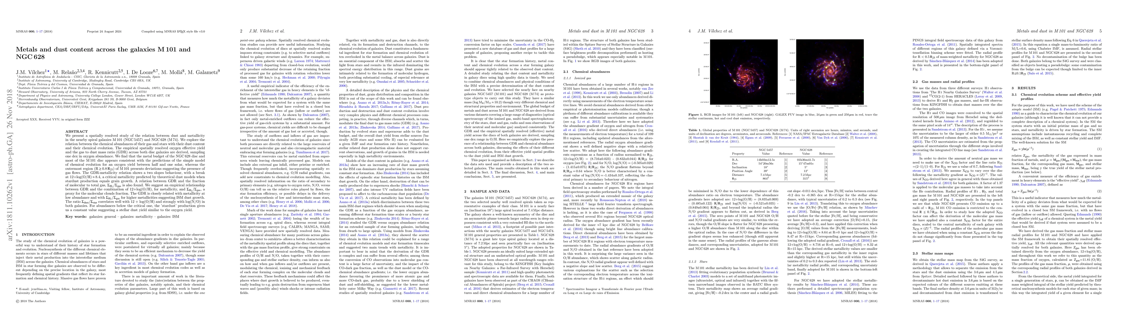 This study investigates the relationship between dust content and metallicity in the spiral galaxies M101 and NGC 628, finding that the metal budget in most regions aligns with simple chemical evolution models. The gas-to-dust mass ratio (GDR) shows a two-slope behavior linked to metallicity and molecular gas fraction, suggesting ISM dust growth.