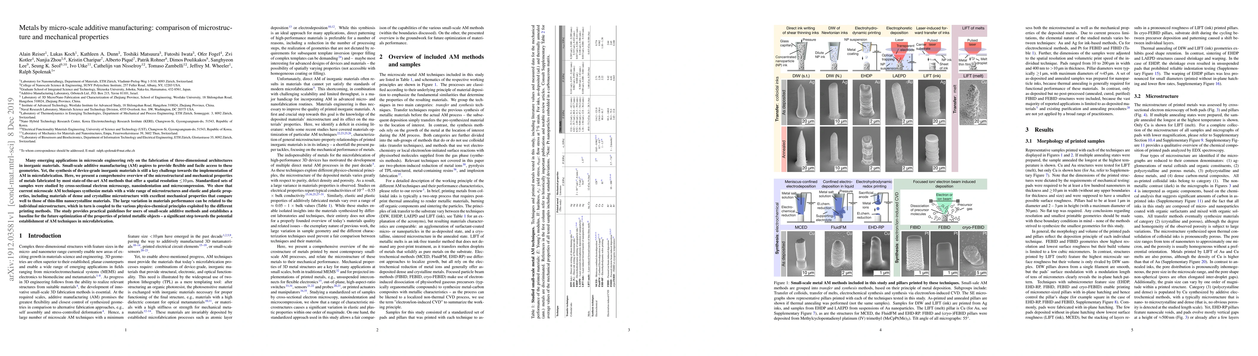 Many emerging applications in microscale engineering rely on the fabrication of three-dimensional architectures in inorganic materials. Small-scale additive manufacturing (AM) aspires to provide flexible and facile access to these geometries. Yet, the synthesis of device-grade inorganic materials is still a key challenge towards the implementation of AM in microfabrication. Here, we present a comprehensive overview of the microstructural and mechanical properties of metals fabricated by most state-of-the-art AM methods that offer a spatial resolution $\leq$10$\mu$m. Standardized sets of samples were studied by cross-sectional electron microscopy, nanoindentation and microcompression. We show that current microscale AM techniques synthesize metals with a wide range of microstructures and elastic and plastic properties, including materials of dense and crystalline microstructure with excellent mechanical properties that compare well to those of thin-film nanocrystalline materials. The large variation in materials performance can be related to the individual microstructure, which in turn is coupled to the various physico-chemical principles exploited by the different printing methods. The study provides practical guidelines for users of small-scale additive methods and establishes a baseline for the future optimization of the properties of printed metallic objects $-$ a significant step towards the potential establishment of AM techniques in microfabrication.