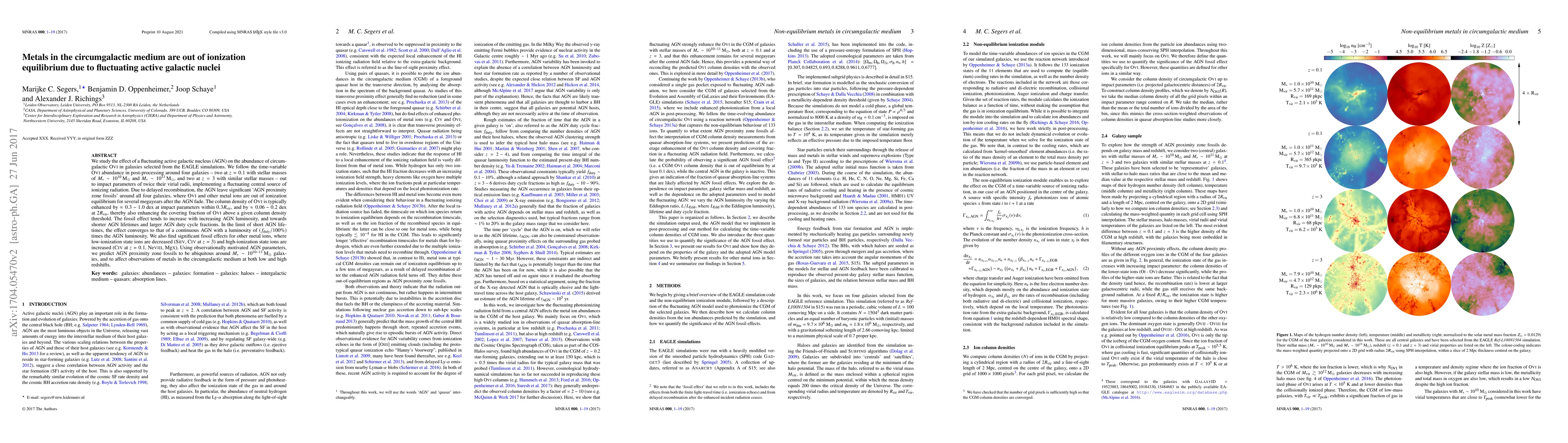 The research finds that active galactic nuclei (AGN) can cause metals in the circumgalactic medium to be out of ionization equilibrium due to delayed recombination, leaving 'fossil' traces for megayears. This effect is significant within 0.3 virial radii and varies with AGN luminosity, influencing observations of metals in the CGM at both low and high redshifts.