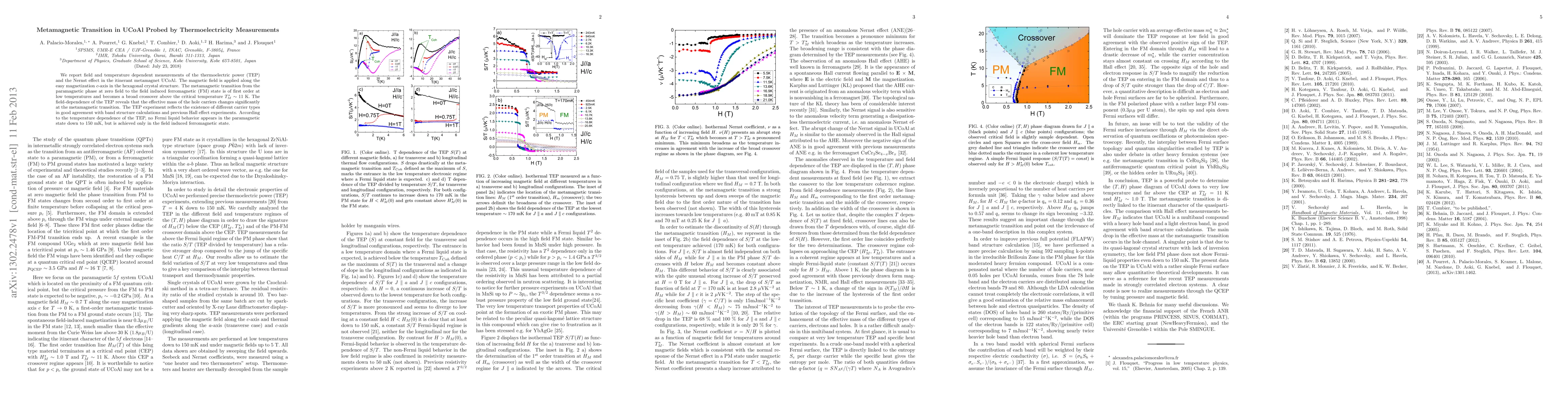 This paper investigates the metamagnetic transition in UCoAl through thermoelectric power and Nernst effect measurements, revealing a first-order transition at low temperatures that broadens above $T^{\star}_{M} \sim 11$ K. The study finds significant changes in hole carrier effective mass and different carrier types, with no Fermi liquid behavior in the paramagnetic state but its presence in the induced ferromagnetic state.