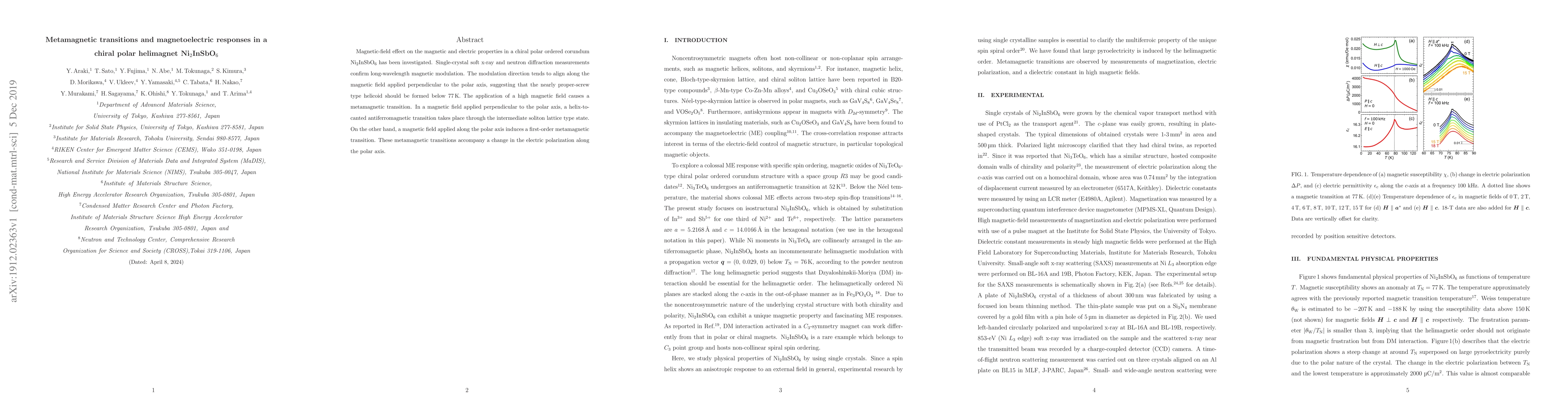 Magnetic-field effect on the magnetic and electric properties in a chiral polar ordered corundum Ni$_2$InSbO$_6$ has been investigated. Single-crystal soft x-ray and neutron diffraction measurements confirm long-wavelength magnetic modulation. The modulation direction tends to align along the magnetic field applied perpendicular to the polar axis, suggesting that the nearly proper-screw type helicoid should be formed below 77\,K. The application of a high magnetic field causes a metamagnetic transition. In a magnetic field applied perpendicular to the polar axis, a helix-to-canted antiferromagnetic transition takes place through the intermediate soliton lattice type state. On the other hand, a magnetic field applied along the polar axis induces a first-order metamagnetic transition. These metamagnetic transitions accompany a change in the electric polarization along the polar axis.