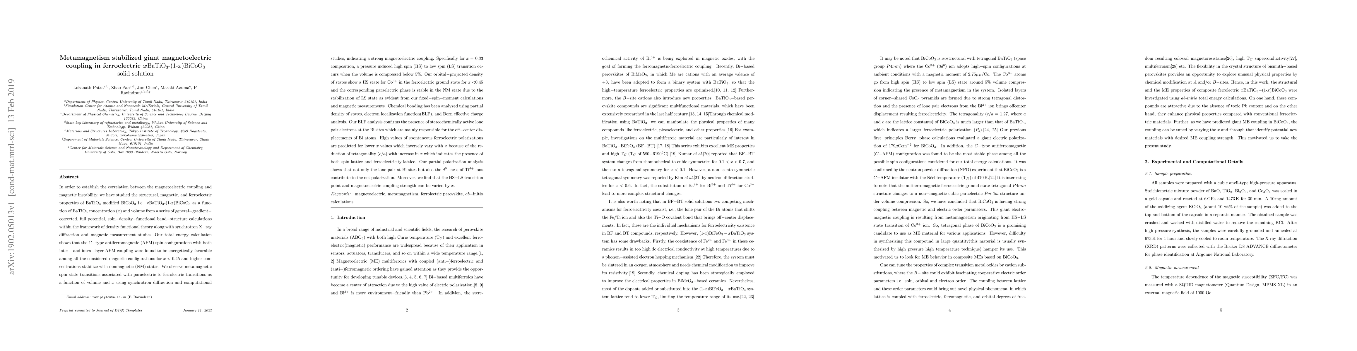 In order to establish the correlation between the magnetoelectric coupling and magnetic instability, we have studied the structural, magnetic, and ferroelectric properties of \textit{x}BaTiO${_3}$-(1-\textit{x})BiCoO${_3}$ as a function of BaTiO$_3$ concentration ($x$) and volume.The $G-$type antiferromagnetic ordering is found to be energetically favorable for $x<$ 0.45 and higher concentrations stabilize with nonmagnetic states. We observe metamagnetic spin state transitions associated with paraelectric to ferrolectric transitions as a function of volume and $x$ using synchrotron diffraction and computational studies, indicating a strong magnetoelectric coupling. Specifically for $x=$ 0.33 composition, a pressure induced high spin (HS) to low spin (LS) transition occurs when the volume is compressed below 5\%. Our orbital$-$projected density of states show a HS state for Co$^{3+}$ in the ferroelectric ground state for $x<$ 0.45 and the corresponding paraelectric phase is stable in the nonmagnetic state due to the stabilization of LS state as evident from our fixed$-$spin$-$moment calculations and magnetic measurements. High values of spontaneous ferroelectric polarizations are predicted for lower $x$ values which inversely vary with $x$ because of the reduction of tetragonality ($c/a$) with increase in $x$. Moreover, we find that the HS$-$LS transition point and magnetoelectric coupling strength can be varied by $x$.
