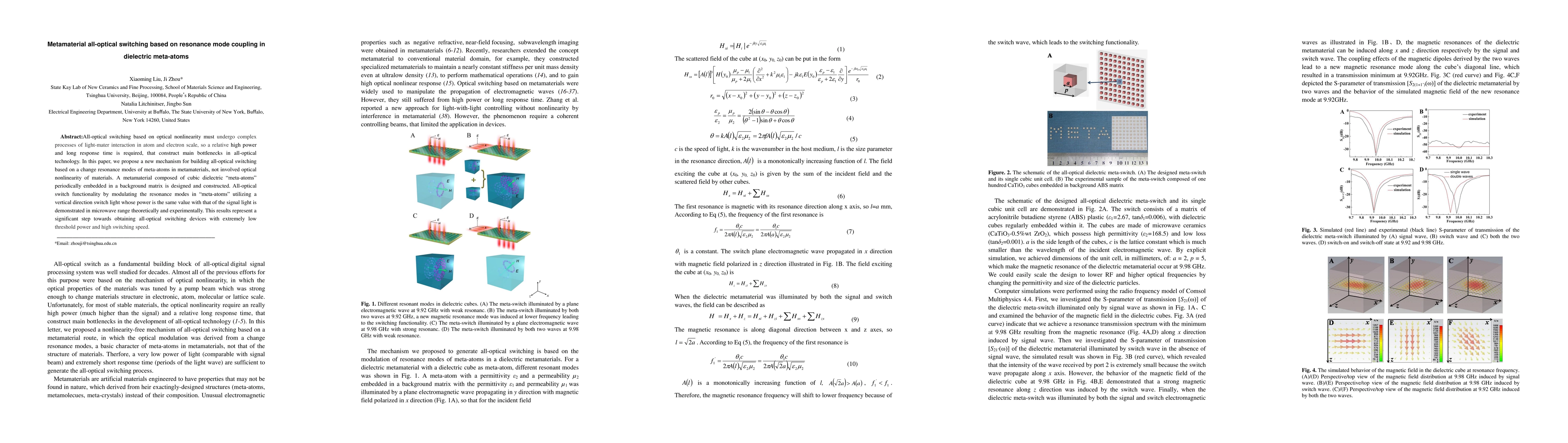 This paper proposes a novel all-optical switching mechanism using resonance mode coupling in dielectric meta-atoms within metamaterials, eliminating the need for optical nonlinearity, thus achieving low threshold power and high switching speed. Experimental and theoretical results demonstrate the functionality in the microwave range.