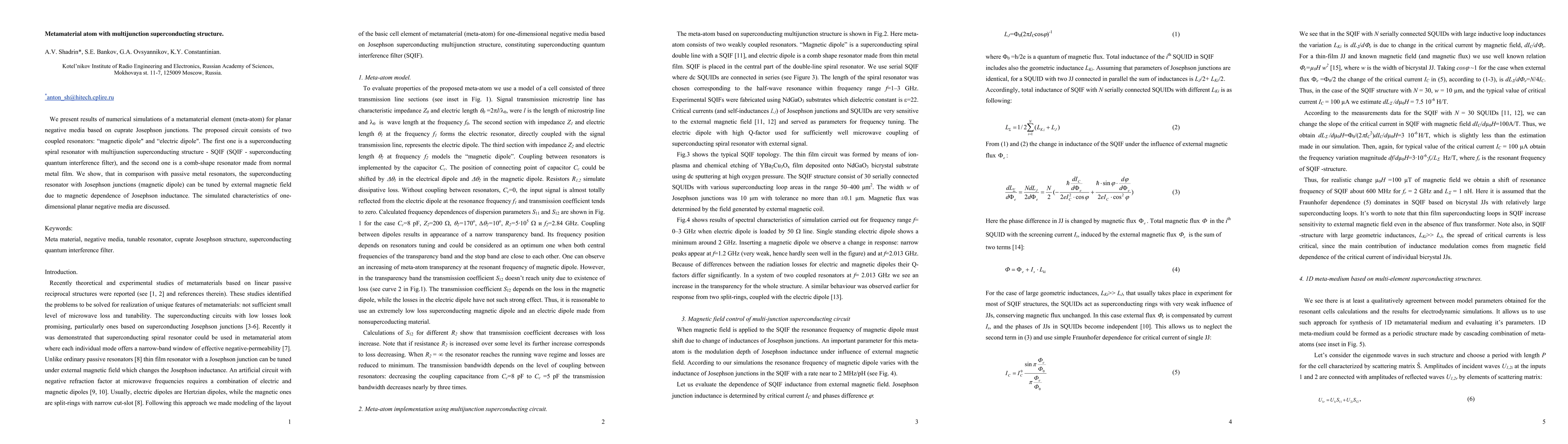 We present results of numerical simulations of a metamaterial element (meta-atom) for planar negative media based on cuprate Josephson junctions. The proposed circuit consists of two coupled resonators: "magnetic dipole" and "electric dipole". The first one is a superconducting spiral resonator with multijunction superconducting structure - SQIF (SQIF - superconducting quantum interference filter), and the second one is a comb-shape resonator made from normal metal film. We show, that in comparison with passive metal resonators, the superconducting resonator with Josephson junctions (magnetic dipole) can be tuned by external magnetic field due to magnetic dependence of Josephson inductance. The simulated characteristics of one-dimensional planar negative media are discussed.