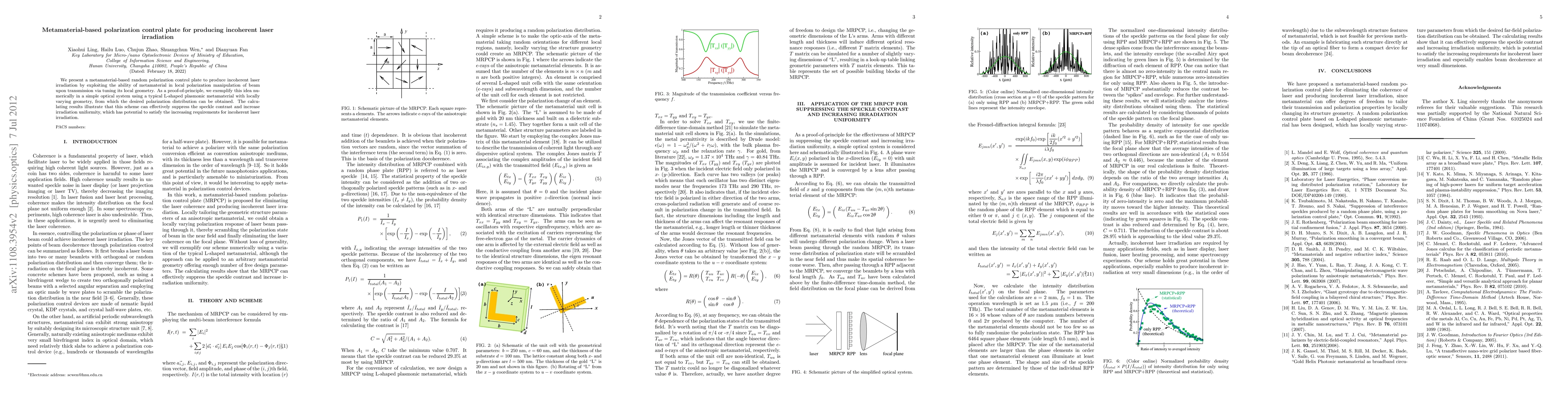 This paper introduces a metamaterial-based polarization control plate designed to produce incoherent laser irradiation by manipulating local polarization through tunable geometry. Numerical simulations demonstrate its effectiveness in reducing speckle contrast and enhancing irradiation uniformity, suggesting potential applications in laser technology.
