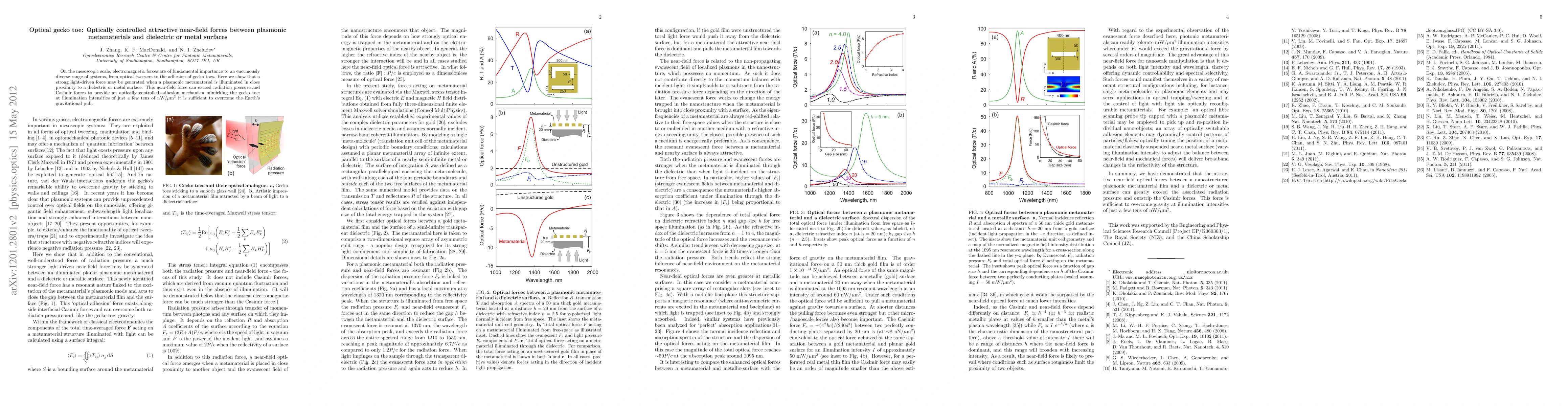 On the mesoscopic scale, electromagnetic forces are of fundamental importance to an enormously diverse range of systems, from optical tweezers to the adhesion of gecko toes. Here we show that a strong light-driven force may be generated when a plasmonic metamaterial is illuminated in close proximity to a dielectric or metal surface. This near-field force can exceed radiation pressure and Casimir forces to provide an optically controlled adhesion mechanism mimicking the gecko toe: at illumination intensities of just a few tens of nW/um^2 it is sufficient to overcome the Earth's gravitational pull.
