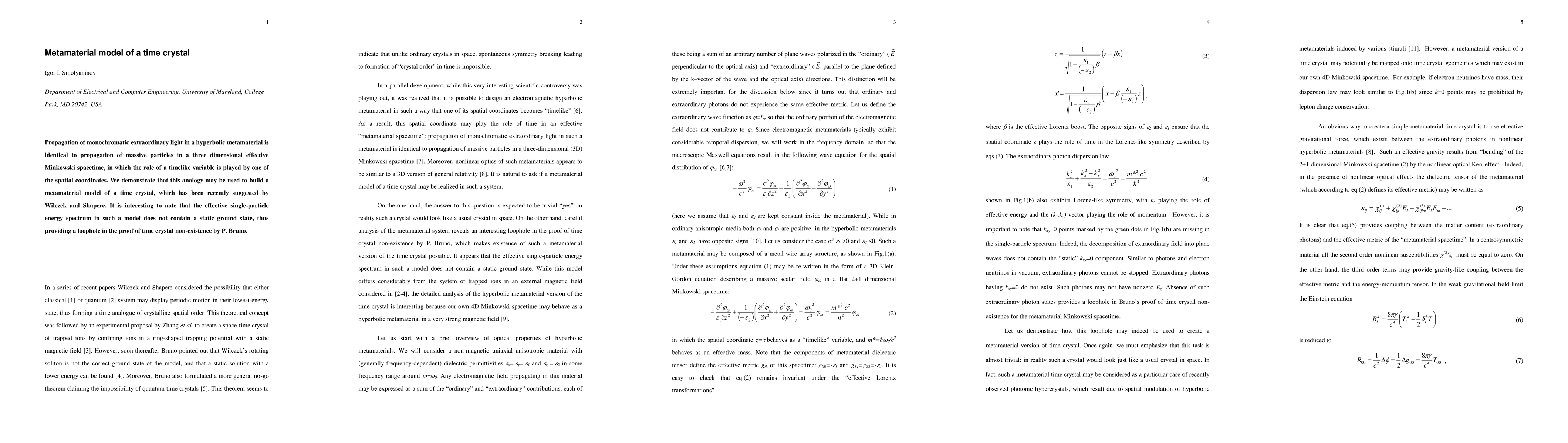 This paper proposes a metamaterial model of a time crystal, demonstrating that light propagation in a hyperbolic metamaterial mimics massive particle movement in an effective Minkowski spacetime. It also highlights a loophole in the proof of time crystal non-existence, suggesting the model's potential to support time crystal phenomena.