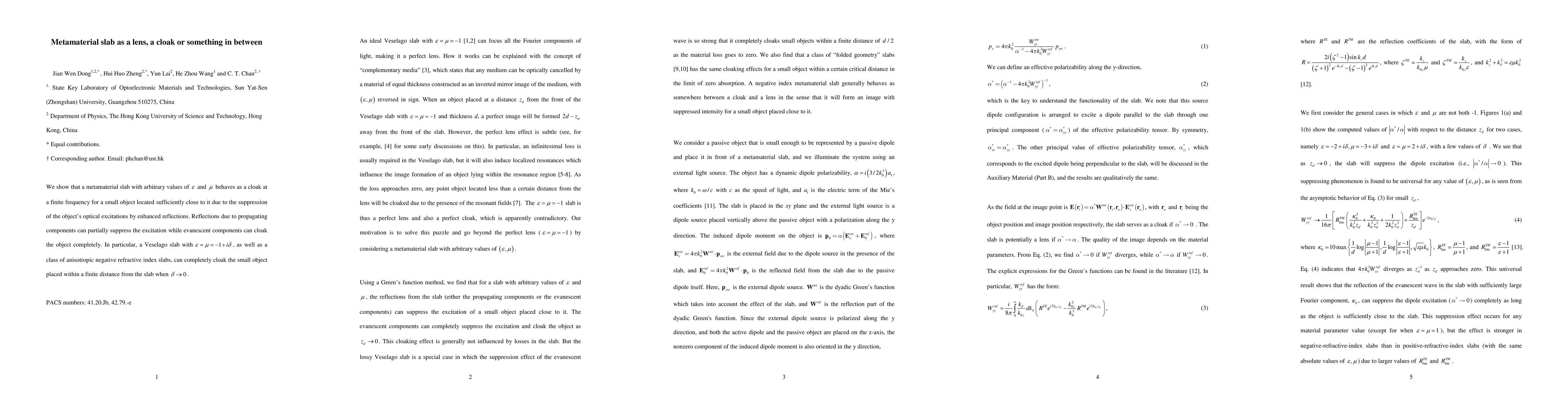 We show that a metamaterial slab with arbitrary values of epsilon and mu behaves as a cloak at a finite frequency for a small object located sufficiently close to it due to the suppression of the object's optical excitations by enhanced reflections. Reflections due to propagating components can partially suppress the excitation while evanescent components can cloak the object completely. In particular, a Veselago slab with epsilon = mu = -1 + i delta, as well as a class of anisotropic negative refractive index slabs, can completely cloak the small object placed within a finite distance from the slab when delta -> 0.