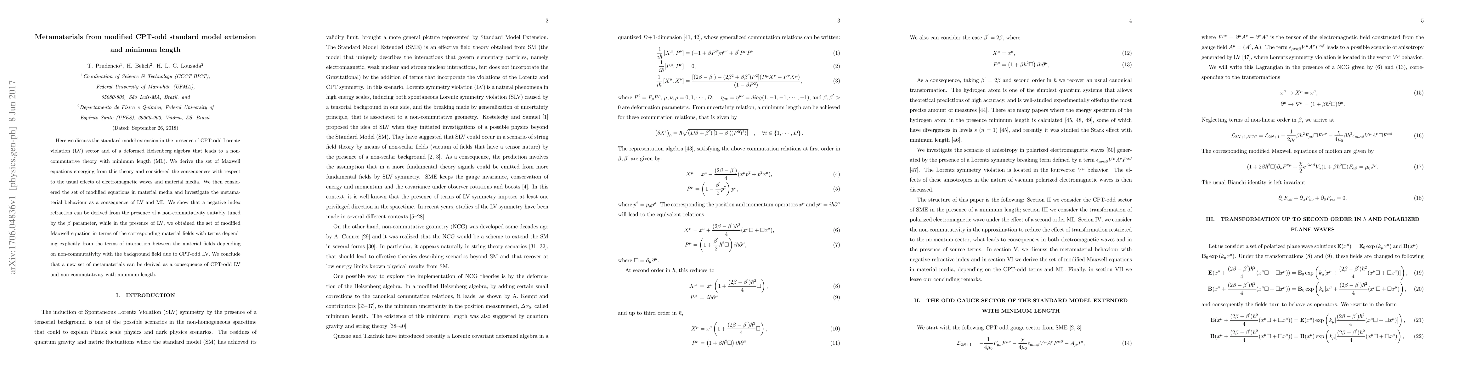 This paper explores the Standard Model Extension with CPT-odd Lorentz violation and minimum length, deriving modified Maxwell equations that lead to metamaterial properties, including negative index refraction, through non-commutativity and interaction terms influenced by CPT-odd Lorentz violation.