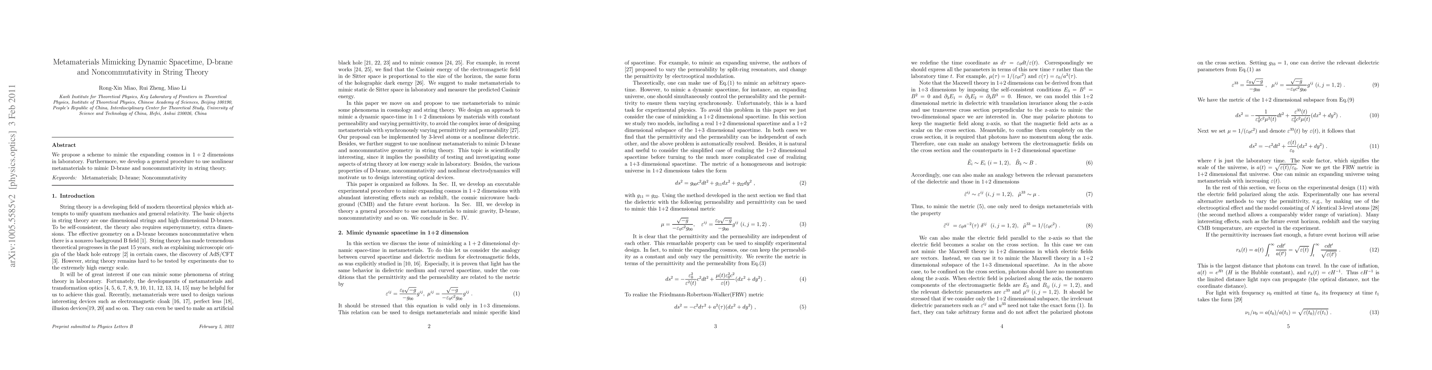 We propose an executable scheme to mimic the expanding cosmos in 1+2 dimensions in laboratory. Furthermore, we develop a general procedure to use nonlinear metamaterials to mimic D-brane and noncommutativity in string theory.
