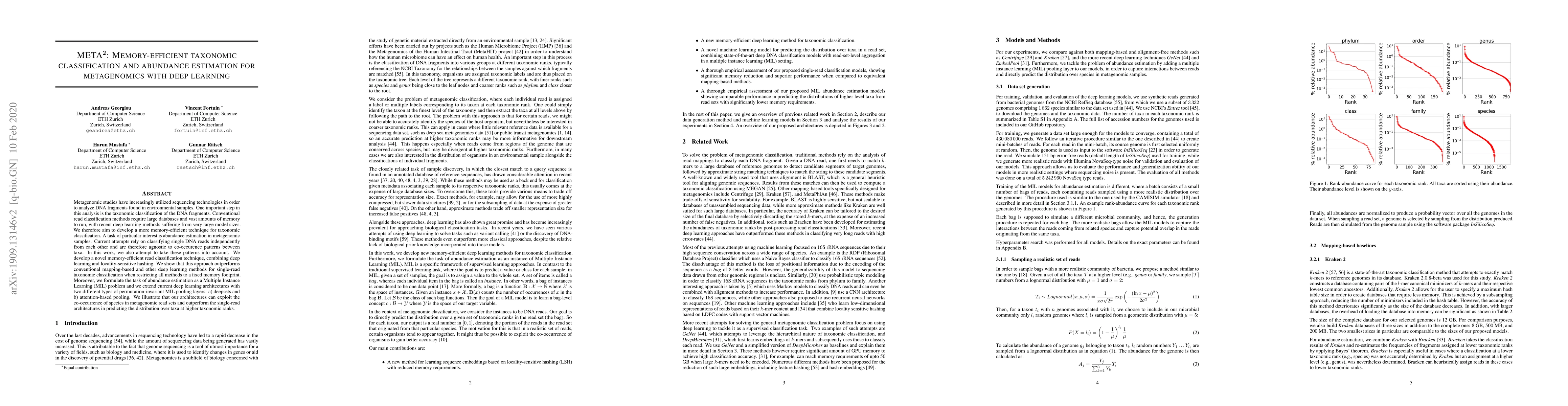 This paper introduces META$^\mathbf{2}$, a memory-efficient deep learning method for taxonomic classification and abundance estimation in metagenomics. It combines deep learning with locality-sensitive hashing to outperform conventional methods within a fixed memory limit, and employs Multiple Instance Learning with deepsets and attention-based pooling to better capture co-occurrence patterns for improved abundance estimation.