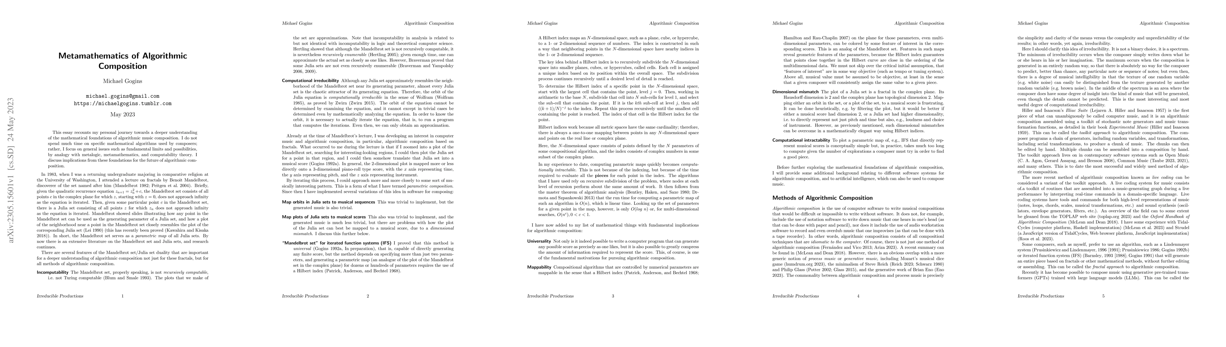 This paper explores the metamathematical foundations underlying algorithmic music composition, emphasizing fundamental limits and possibilities akin to metalogic and computability theory, rather than specific algorithms, and discusses their implications for the future of the field.