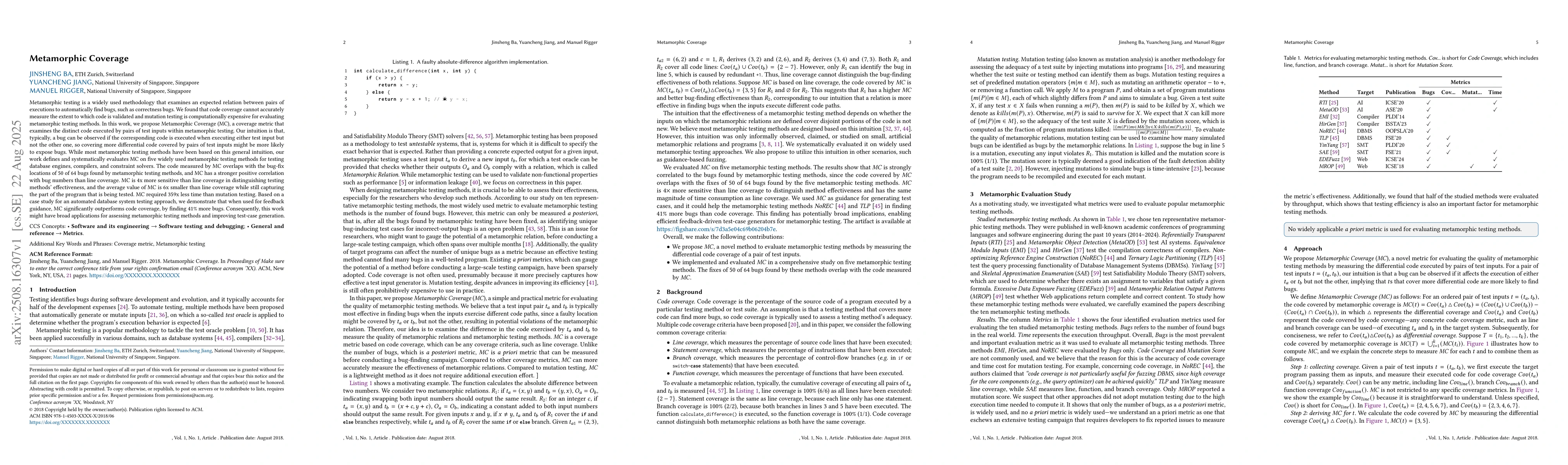 Metamorphic testing is a widely used methodology that examines an expected relation between pairs of executions to automatically find bugs, such as correctness bugs. We found that code coverage cannot accurately measure the extent to which code is validated and mutation testing is computationally expensive for evaluating metamorphic testing methods. In this work, we propose Metamorphic Coverage (MC), a coverage metric that examines the distinct code executed by pairs of test inputs within metamorphic testing. Our intuition is that, typically, a bug can be observed if the corresponding code is executed when executing either test input but not the other one, so covering more differential code covered by pairs of test inputs might be more likely to expose bugs. While most metamorphic testing methods have been based on this general intuition, our work defines and systematically evaluates MC on five widely used metamorphic testing methods for testing database engines, compilers, and constraint solvers. The code measured by MC overlaps with the bug-fix locations of 50 of 64 bugs found by metamorphic testing methods, and MC has a stronger positive correlation with bug numbers than line coverage. MC is 4x more sensitive than line coverage in distinguishing testing methods' effectiveness, and the average value of MC is 6x smaller than line coverage while still capturing the part of the program that is being tested. MC required 359x less time than mutation testing. Based on a case study for an automated database system testing approach, we demonstrate that when used for feedback guidance, MC significantly outperforms code coverage, by finding 41\% more bugs. Consequently, this work might have broad applications for assessing metamorphic testing methods and improving test-case generation.