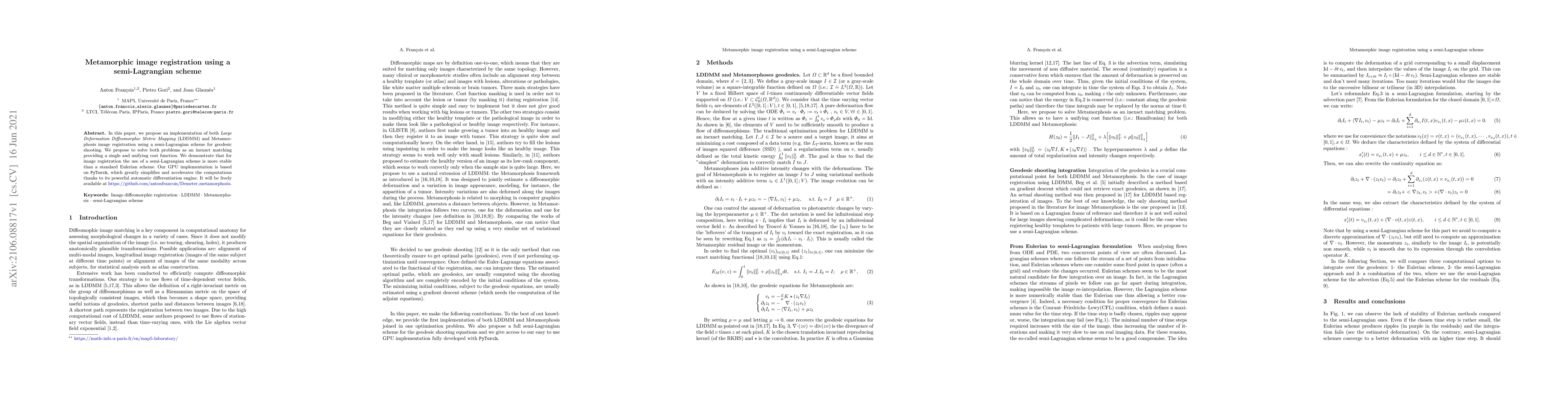 This paper introduces a semi-Lagrangian scheme for implementing Large Deformation Diffeomorphic Metric Mapping and Metamorphosis image registration, showing improved stability over Eulerian methods. The GPU-based PyTorch implementation accelerates computations and is available for public use.