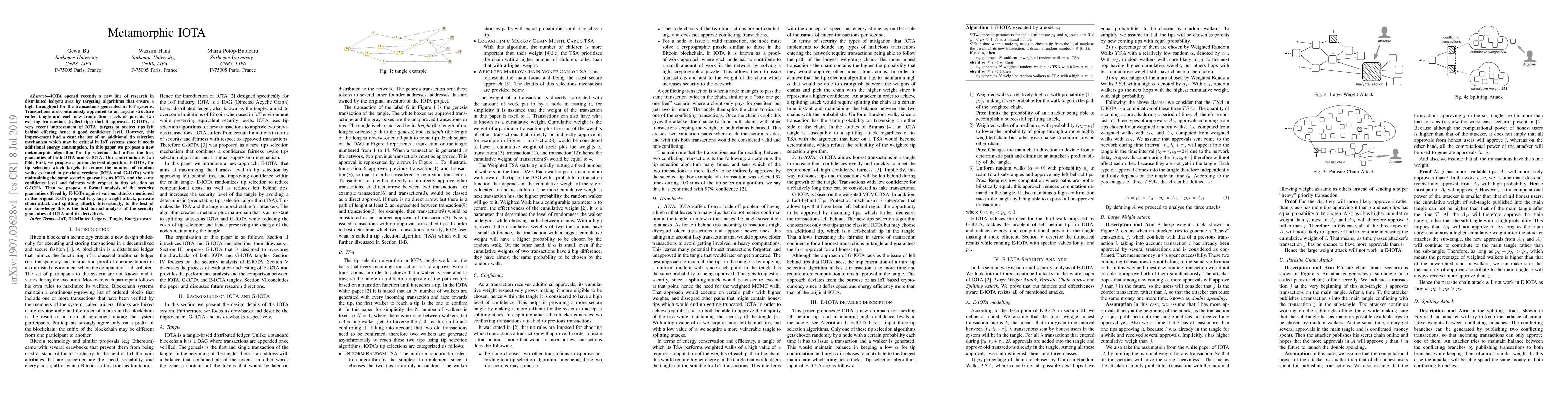 IOTA opened recently a new line of research in distributed ledgers area by targeting algorithms that ensure a high throughput for the transactions generated in IoT systems. Transactions are continuously appended to an acyclic structure called tangle and each new transaction selects as parents two existing transactions (called tips) that it approves. G-IOTA, a very recent improvement of IOTA, targets to protect tips left behind offering hence a good confidence level. However, this improvement had a cost: the use of an additional tip selection mechanism which may be critical in IoT systems since it needs additional energy consumption. In this paper we propose a new metamorphic algorithm for tip selection that offers the best guaranties of both IOTA and G-IOTA. Our contribution is two fold. First, we propose a parameterized algorithm, E-IOTA, for tip selection which targets to reduce the number of random walks executed in previous versions (IOTA and G-IOTA) while maintaining the same security guaranties as IOTA and the same confidence level and fairness with respect to tips selection as G-IOTA. Then we propose a formal analysis of the security guaranties offered by E-IOTA against various attacks mentioned in the original IOTA proposal (e.g. large weight attack, parasite chain attack and splitting attack). Interestingly, to the best of our knowledge this is the first formal analysis of the security guaranties of IOTA and its derivatives.
