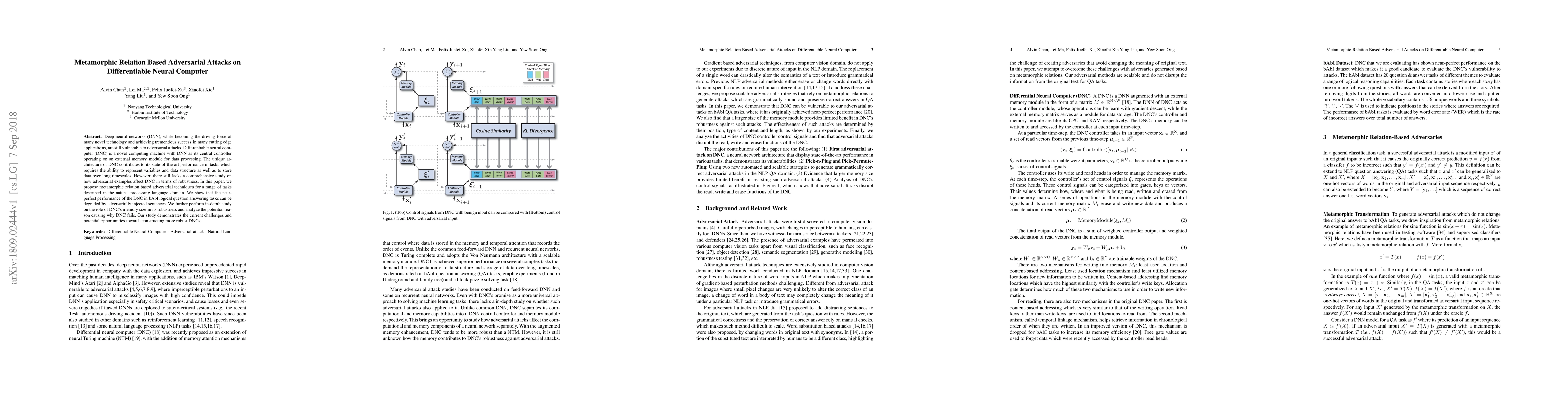 This paper introduces metamorphic relation-based adversarial attacks on Differentiable Neural Computers (DNCs), demonstrating that DNCs, despite their strong performance in natural language processing tasks, are susceptible to adversarial examples. The study highlights that memory size plays a crucial role in DNC's robustness, revealing the current challenges and opportunities for developing more robust DNC architectures.